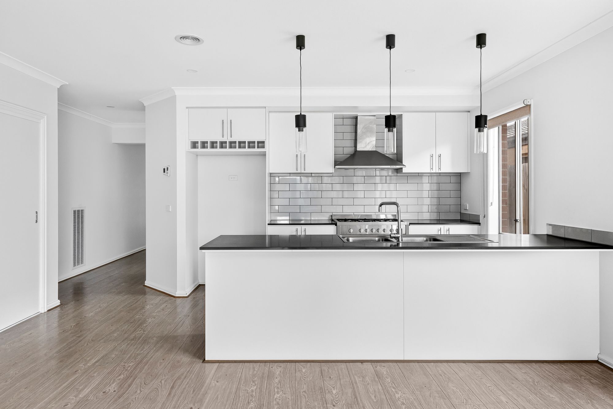 Kitchen: 900mm stainless steel gas cooktop, oven & rangehood, built in pantry with shelving, fridge cavity, 20mm stone benchtops, double sink, chrome finishes, overhead cabinetry, feature pendant lighting, storage drawers, subway tile splash back, timber laminate floorboards, island bench with overhang breakfast bar, dishwasher.