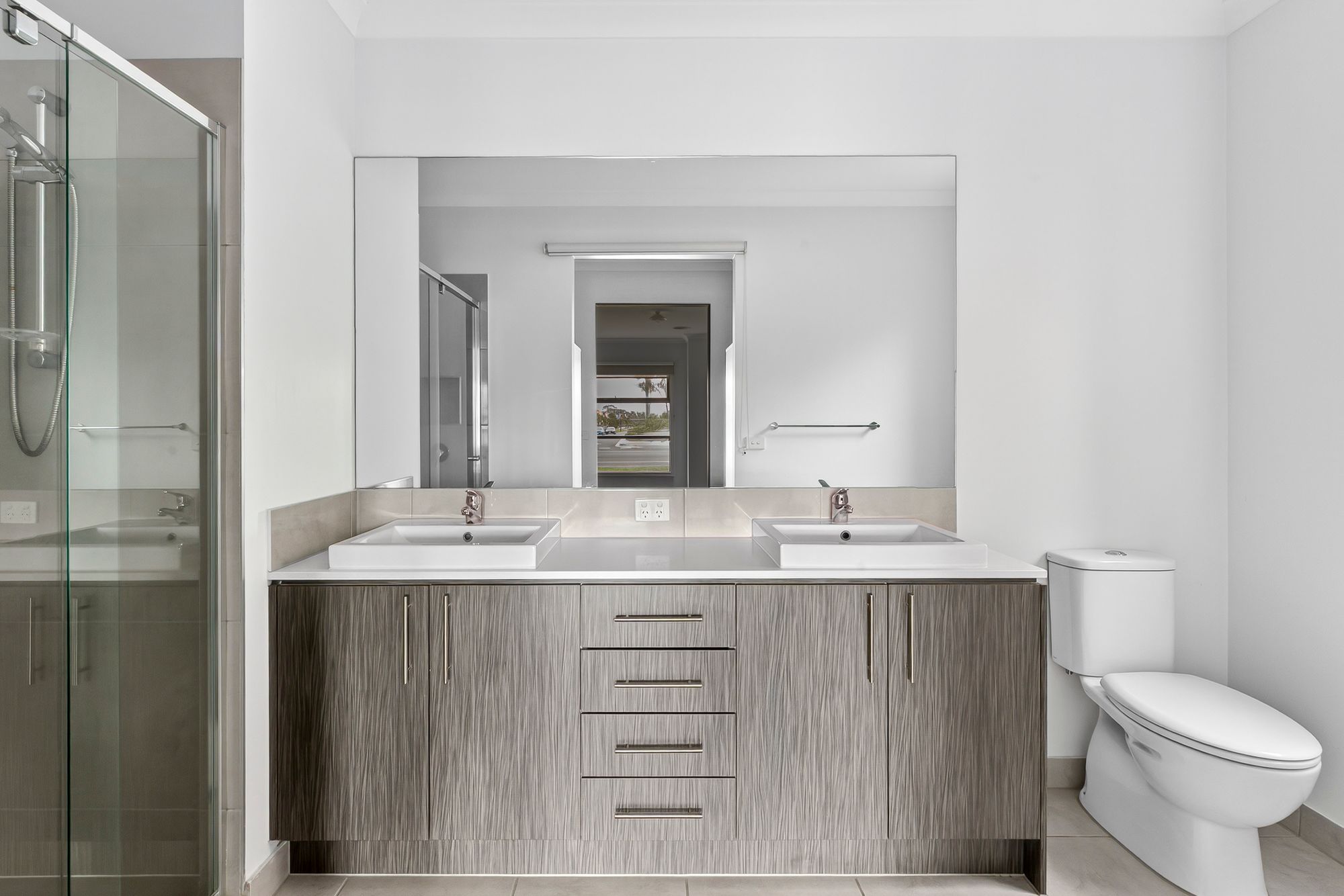 Ensuite with semi-frameless shower, stone benchtop, tiles, double vanity with basins, lots of storage, mirror splash back & toilet.