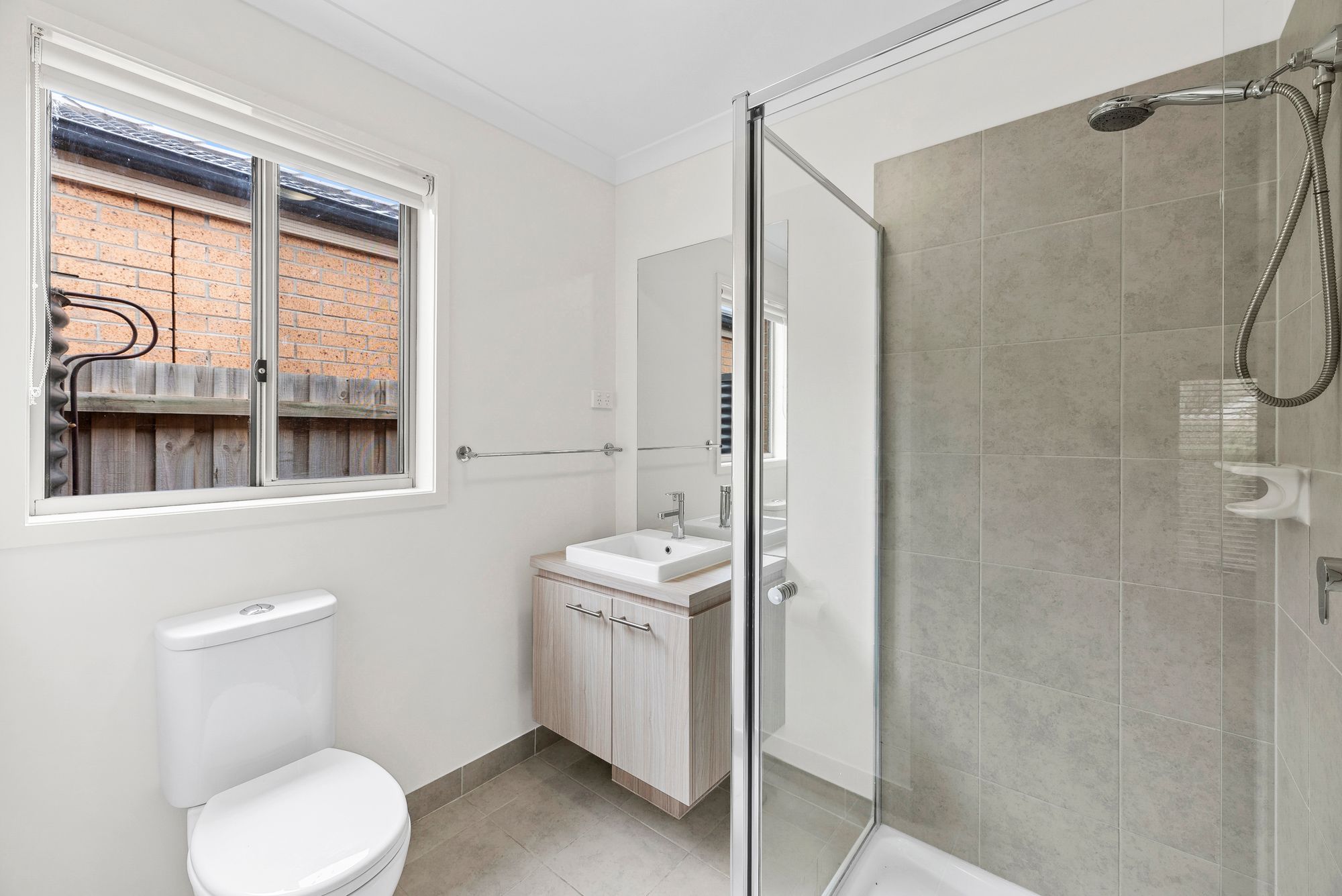 Ensuite: Single vanity with ample storage, semi-frameless shower with hand held shower head, window, roller blinds, towel rack, open toilet.