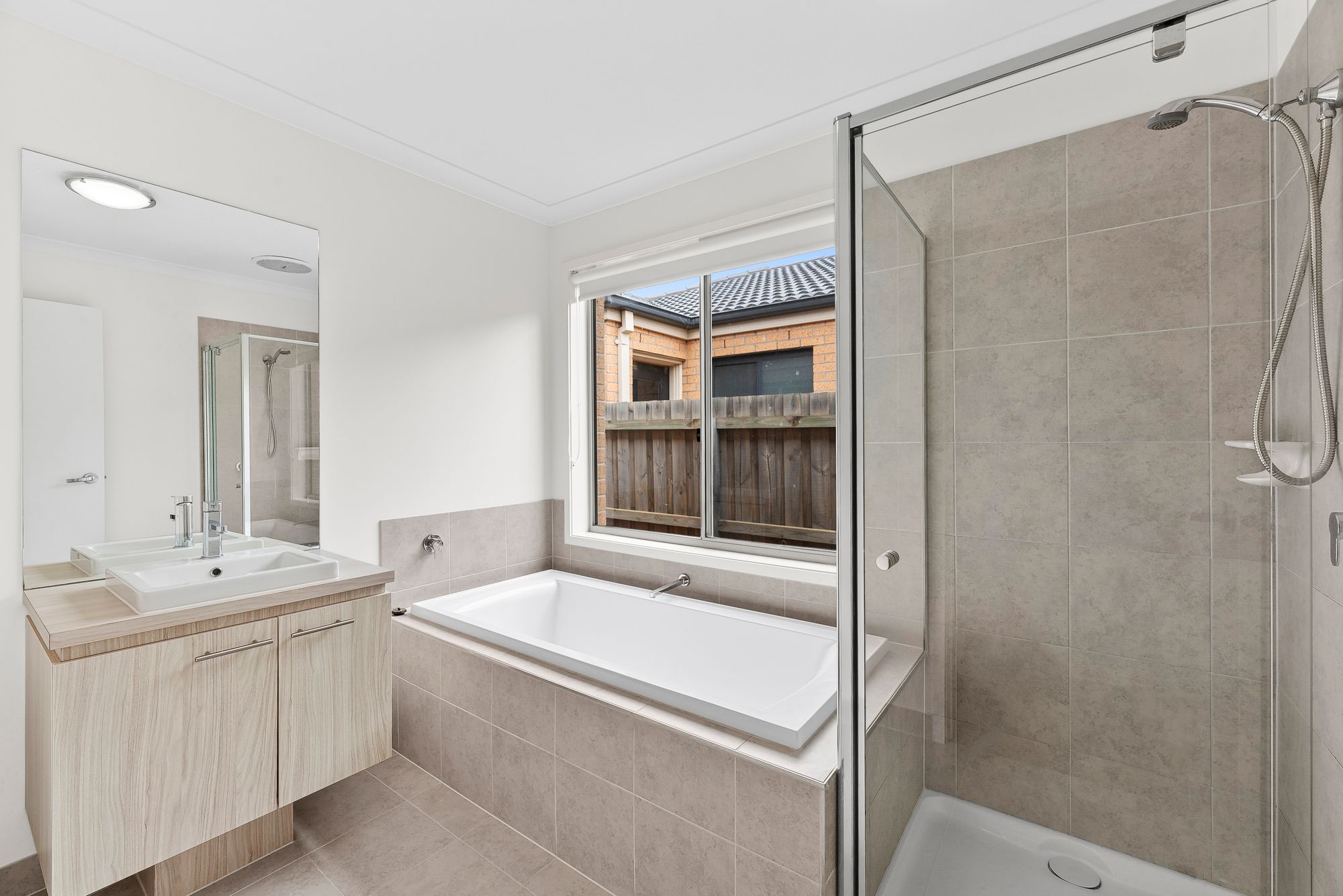 Main bathroom: Single vanity with ample storage, semi-frameless shower with hand held shower head, bath, window, roller blinds, tiles, seperate toilet.