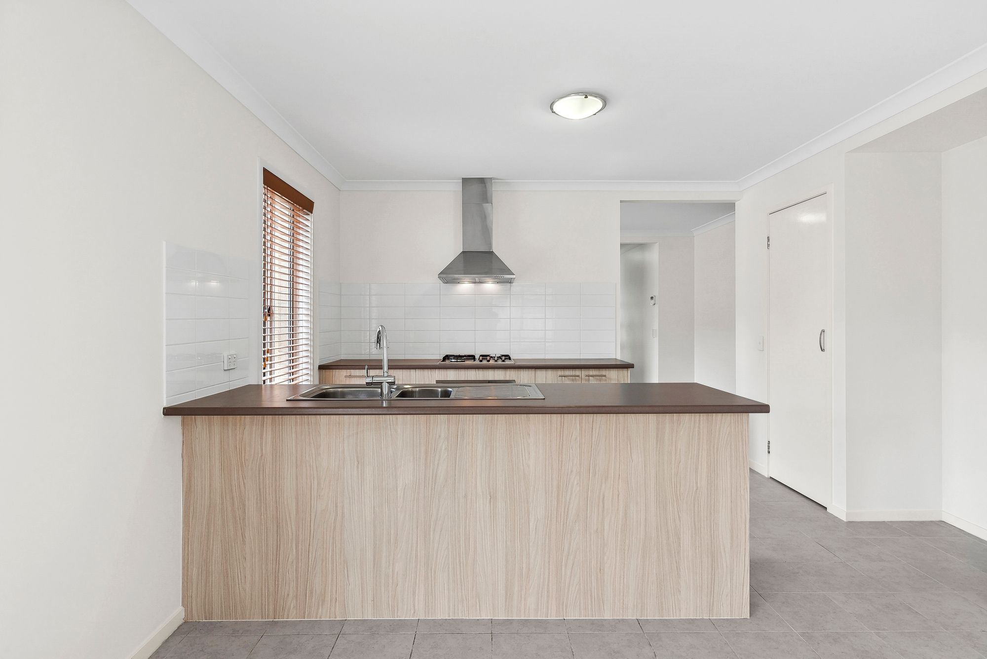 Kitchen: 600mm built in appliances and range hood, breakfast bar overhang, tile splashback, double bowl sink, built in pantry, dishwasher, fridge cavity, microwave cavity, dishwasher, window, Venetian blinds, tiles.
