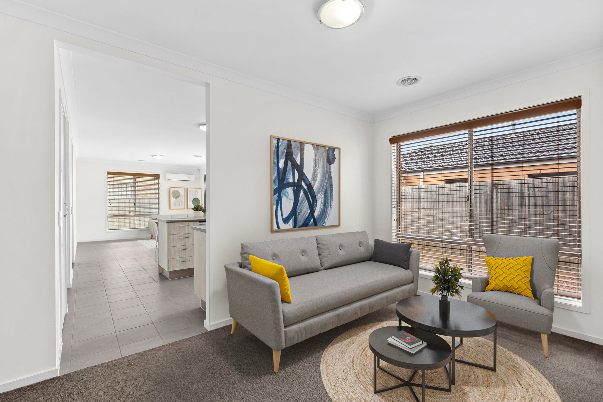 Second living: Semi-secluded, ducted heating, carpet, large window, Venetian blinds.