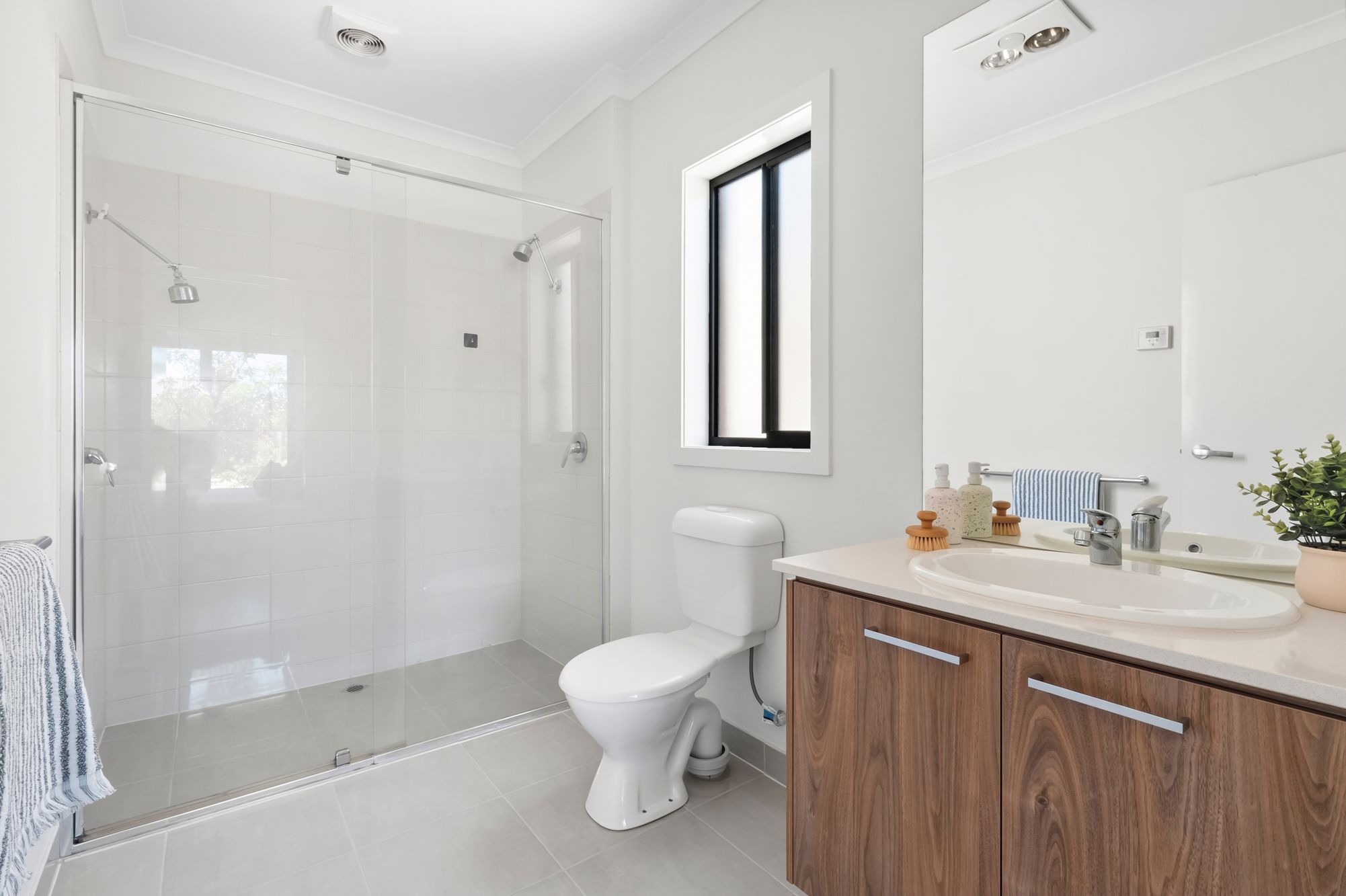 Master Suite: The master suite offers a private and comfortable retreat, featuring soft carpet underfoot, ducted heating, and south-facing windows with roller blinds. Downlights and walk-in robes complete the bedroom, while the stylish ensuite includes a single vanity with 20mm stone benchtops, upgraded cabinetry, a large mirror splashback, and a wide wall-to-wall shower with dual showerheads, along with a toilet for added convenience.