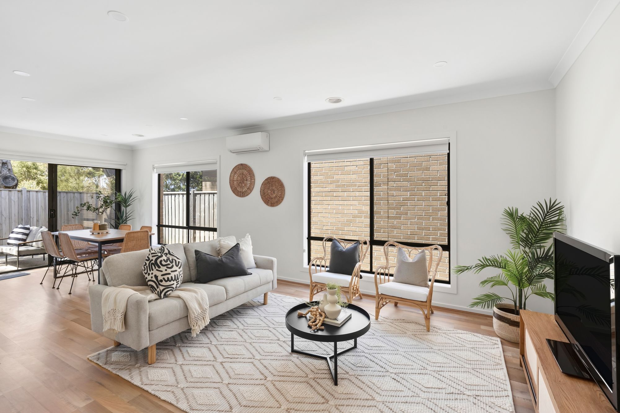 Open Plan Living/Dining: The open plan living and dining area is designed to maximise light and comfort, with high ceilings, timber look flooring, and downlights throughout. North and east-facing windows allow all-day natural sunlight to flood the space, enhanced by wide windows fitted with roller blinds. Glass sliding doors provide seamless access to the north-facing alfresco and rear yard, while ducted heating and split-system cooling ensure climate control in all seasons.