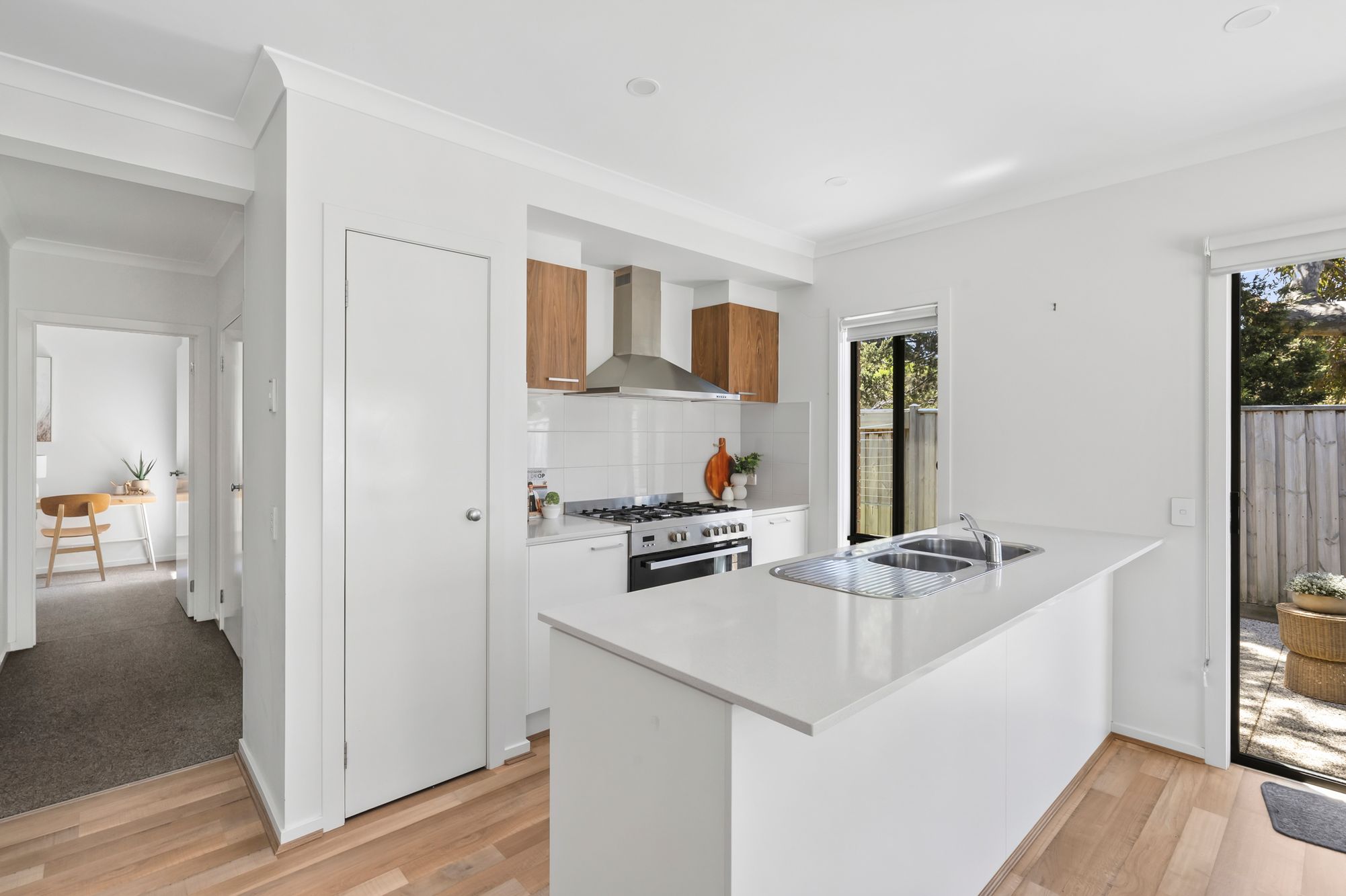 Kitchen: The kitchen is both stylish and practical, featuring 20mm stone benchtops complemented by a tiled splashback and timber look flooring. High ceilings enhance the sense of space, while pendant lighting adds a contemporary touch. The kitchen is equipped with a 900mm freestanding oven and stovetop with rangehood, a double sink, large fridge cavity, and ample cabinetry, making it ideal for everyday living and entertaining. Comfort is assured year-round with ducted heating and split-system cooling.
