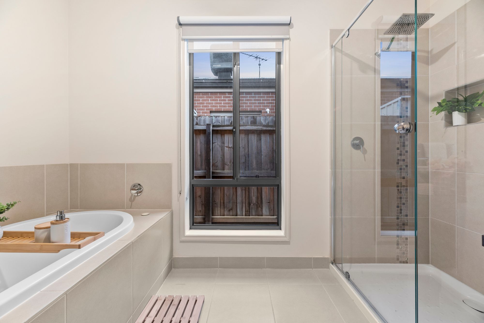 Main bathroom: tiles, bath, semi frameless shower, shower niche, waterfall shower head, dual roller blinds, mirror splashback, laminate benchtop, single vanity, separate toilet