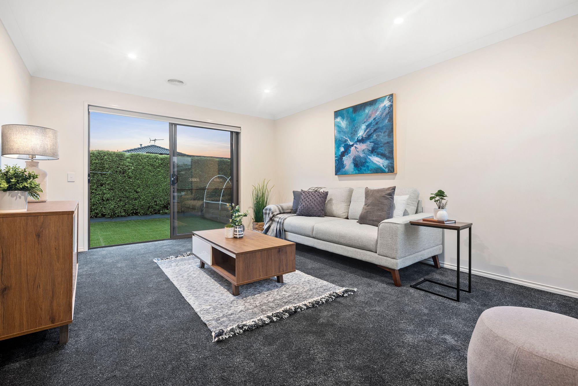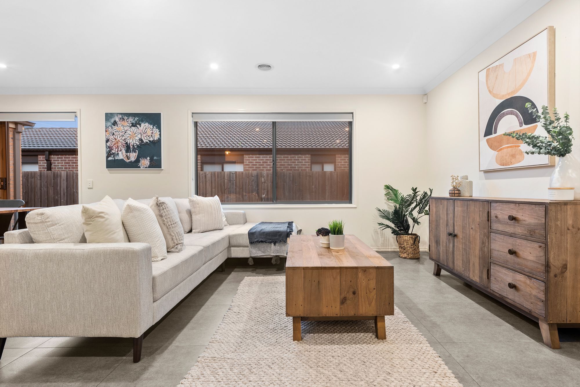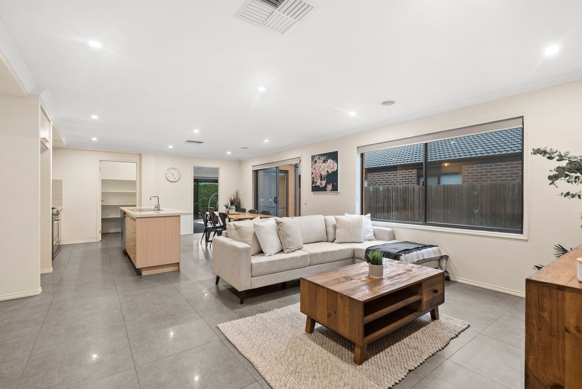 Living: open plan living, dining & kitchen, ducted heating, evaporative cooling, downlights, roller blinds, tiles, glass sliding doors open onto concrete outdoor area