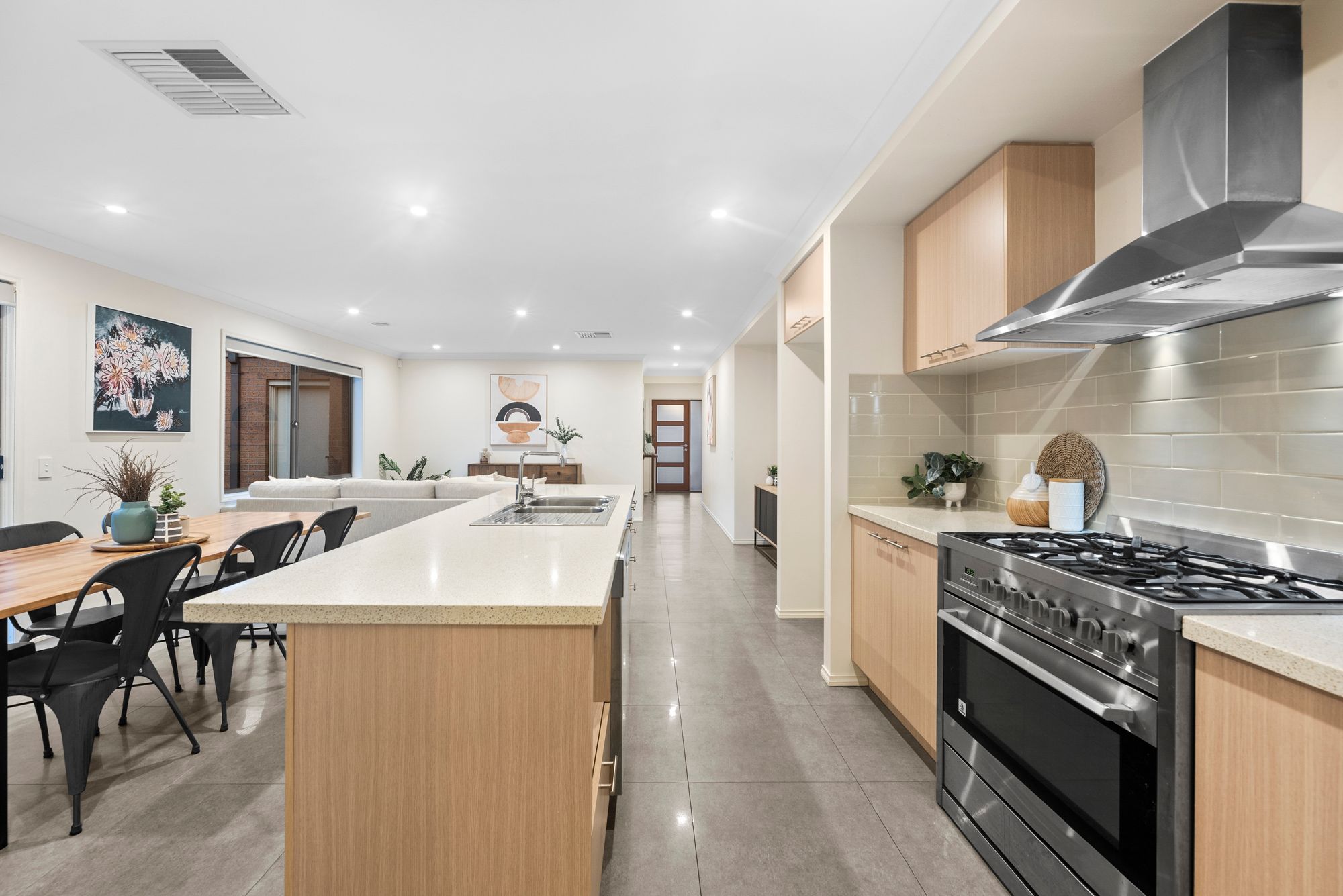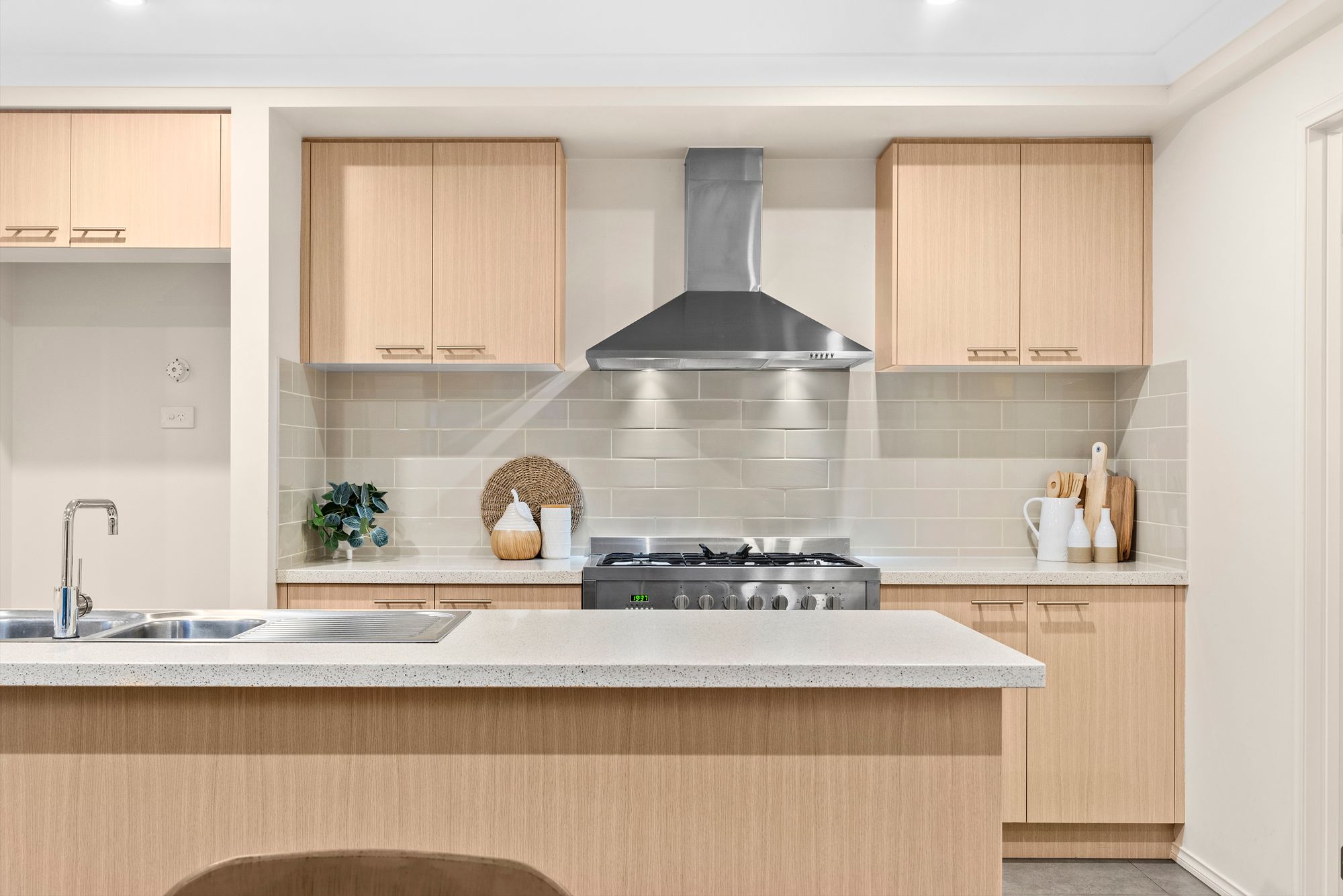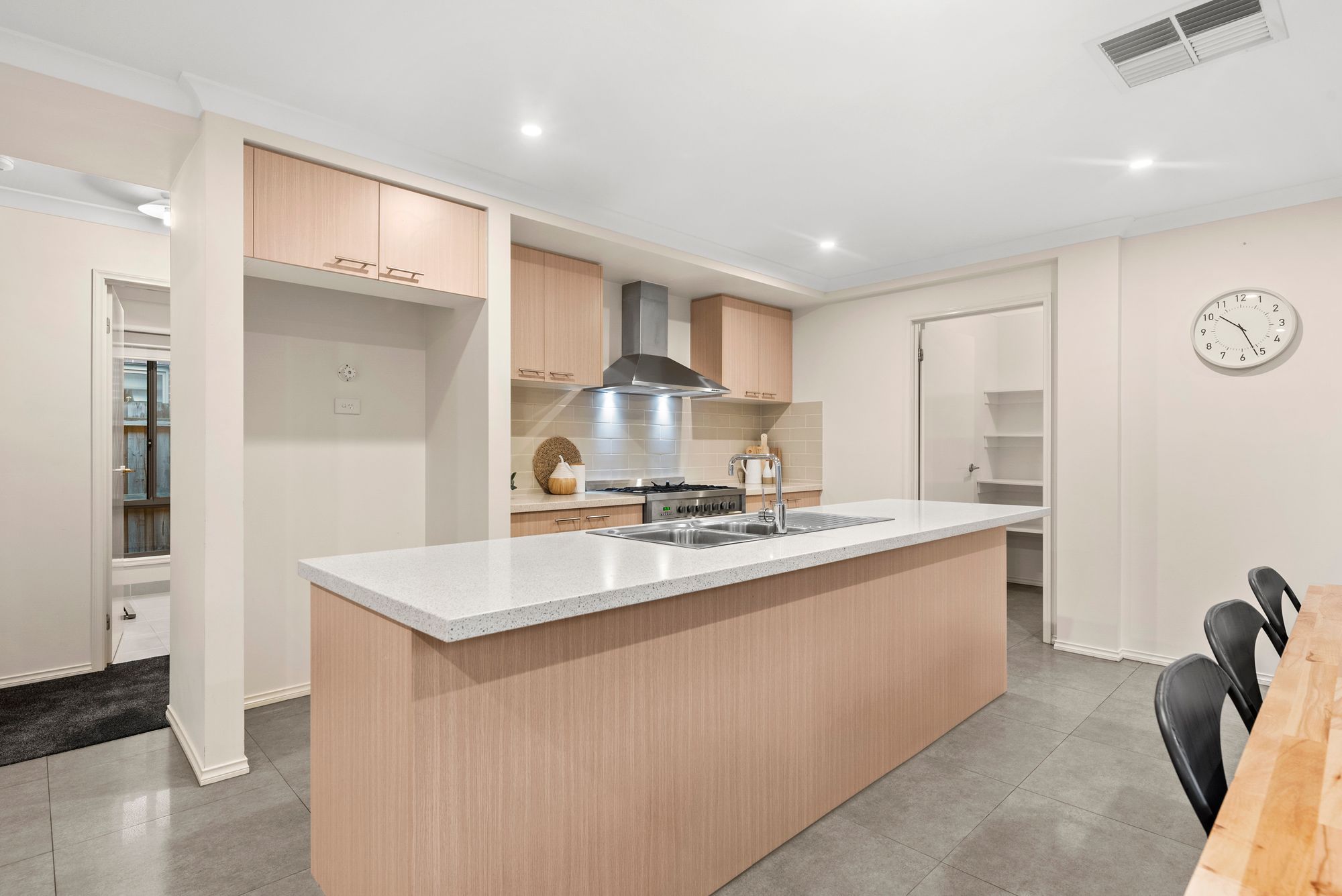 Kitchen: 40mm stone benchtops, island bench with overhang, 900mm freestanding gas cooktop/oven/rangehood, dishwasher, double sink, chrome fittings, generous walk in pantry, downlights, overhead cabinetry, built in microwave provision, tile splash back, storage, tiles