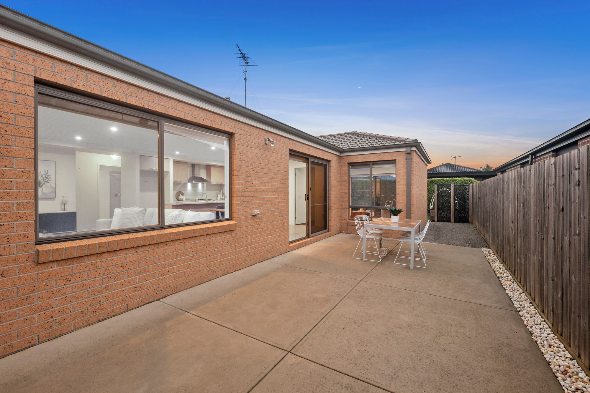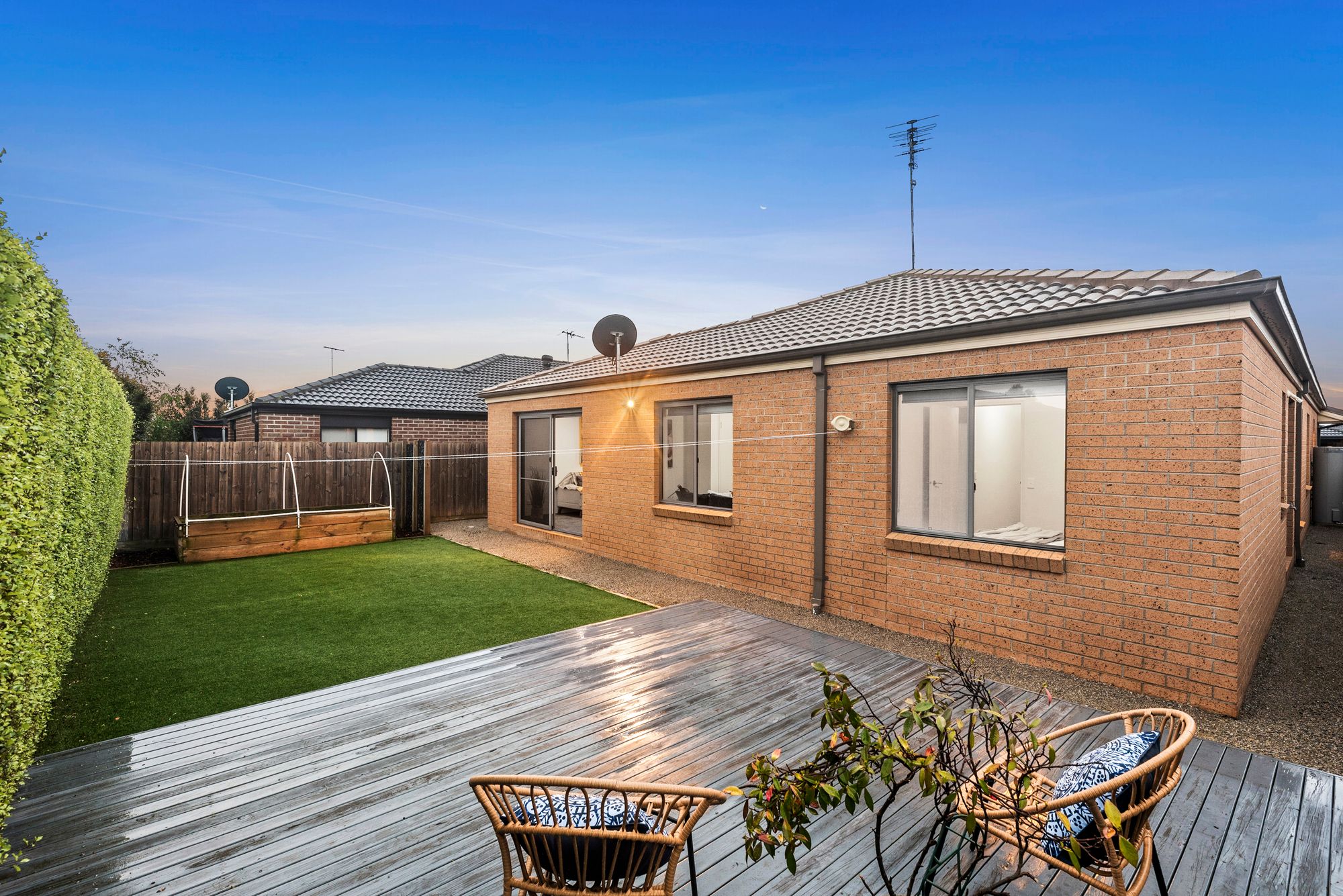 Outdoor: low maintenance backyard yard, synthetic grass & decked area, flood light, vegetable patch, beautiful hedge trees increasing privacy, crushed rock pathway, semi secluded concreted area