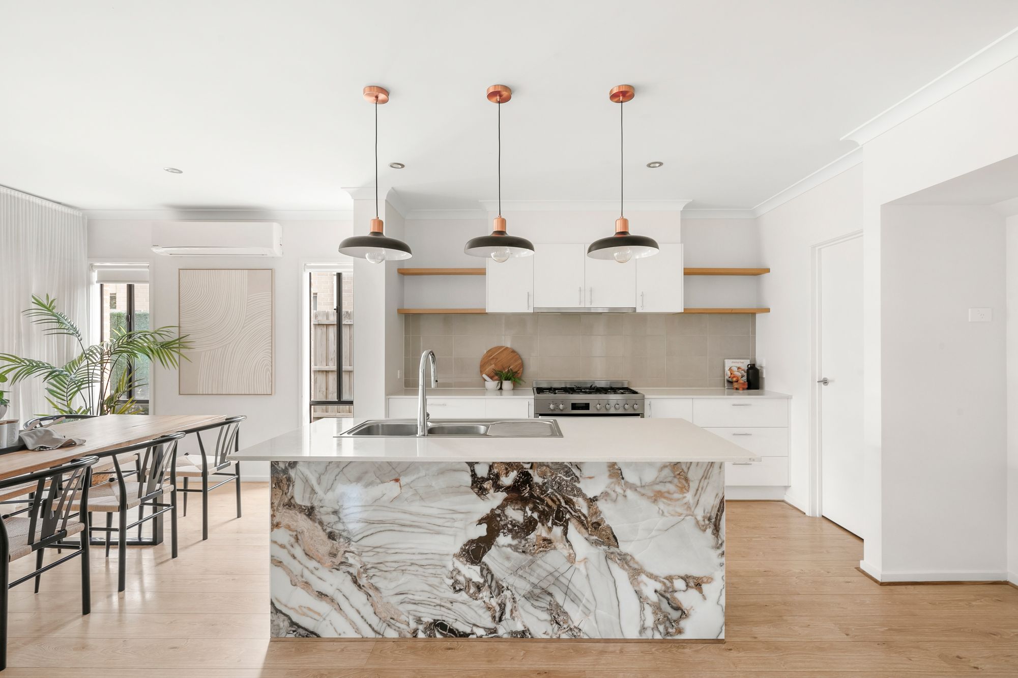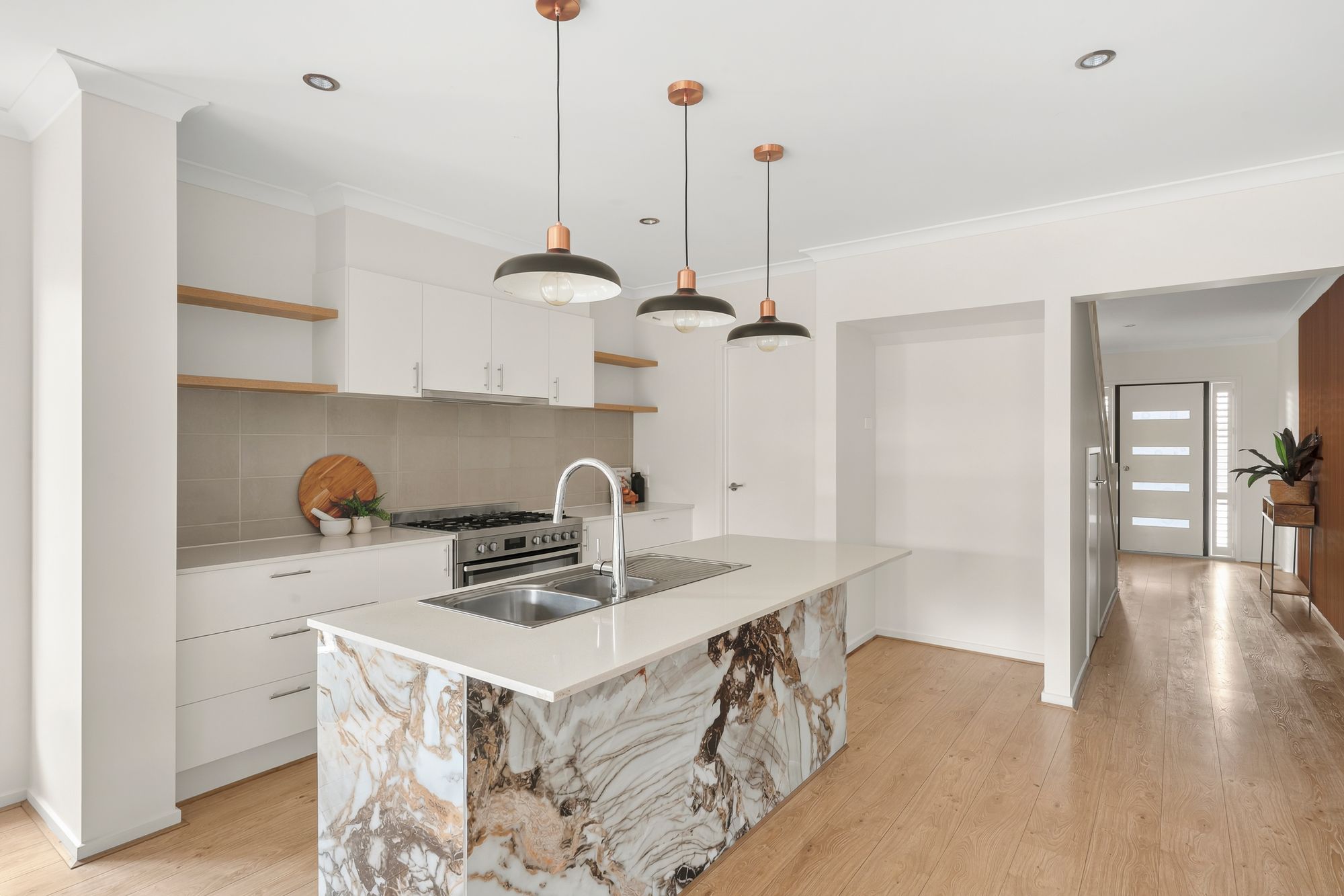 Kitchen: At the heart of the home lies a beautifully appointed kitchen featuring 20mm stone benchtops, statement pendant lighting, a freestanding 900mm oven and stovetop, dishwasher, large fridge cavity, and ample storage through pot drawers, overhead cabinetry and open shelving. A spacious walk-in pantry and stylish floorboards complete the space.