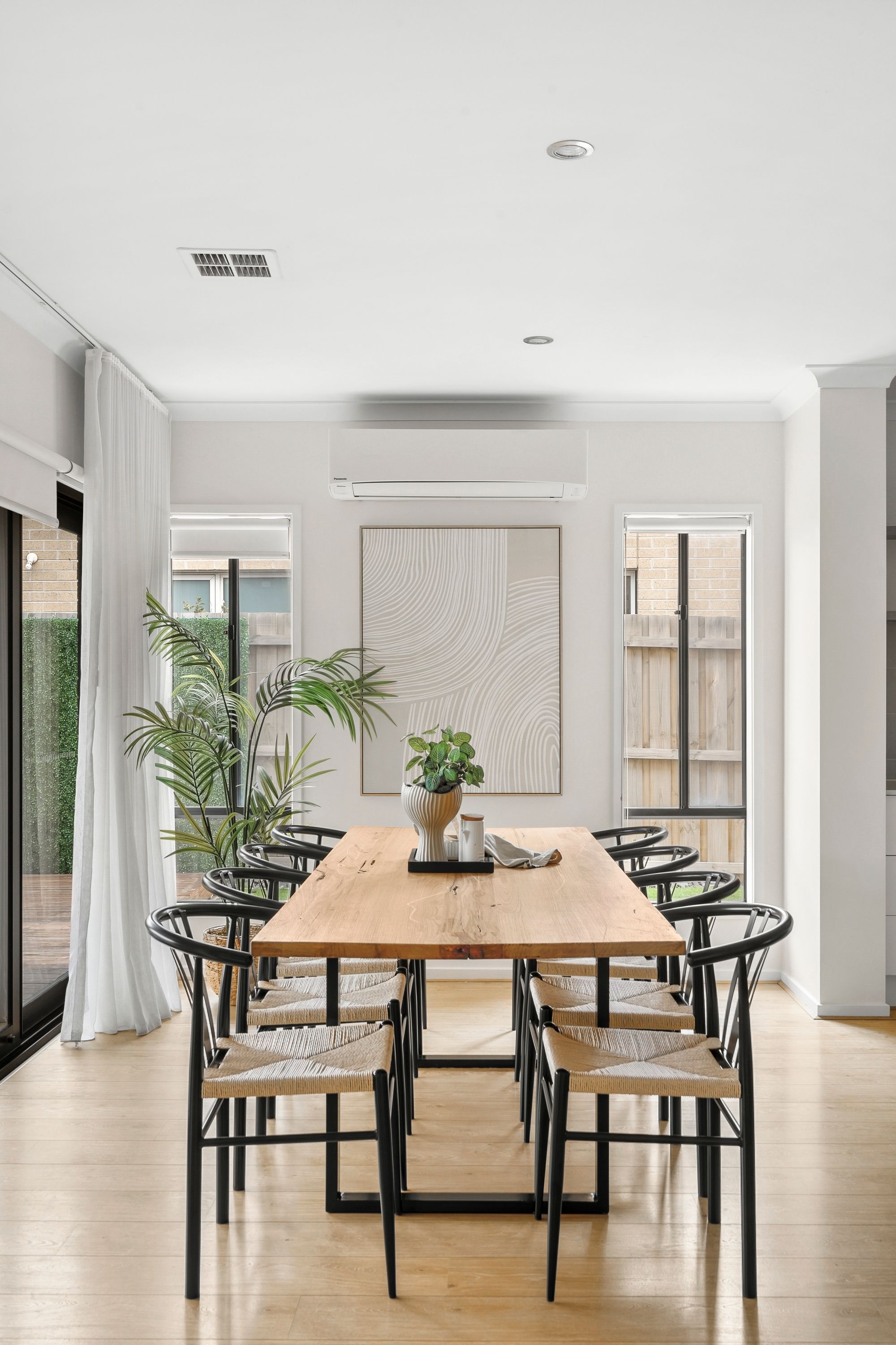 Open Plan Living & Dining: Bathed in natural light, the main living and dining zone flows effortlessly to the rear deck through stacking sliding doors. Enhanced by sheer curtains, blockout blinds, raised ceilings, and climate control via ducted heating and split-system cooling – it’s a warm, welcoming hub for everyday living and entertaining.