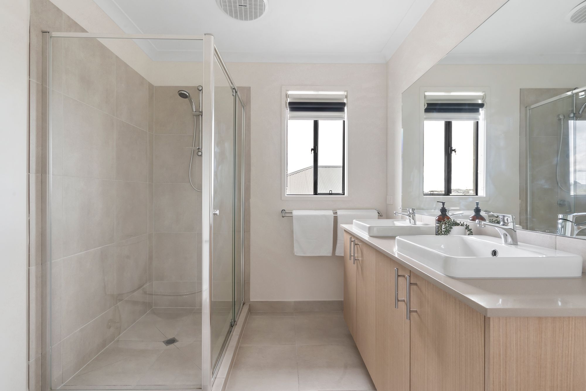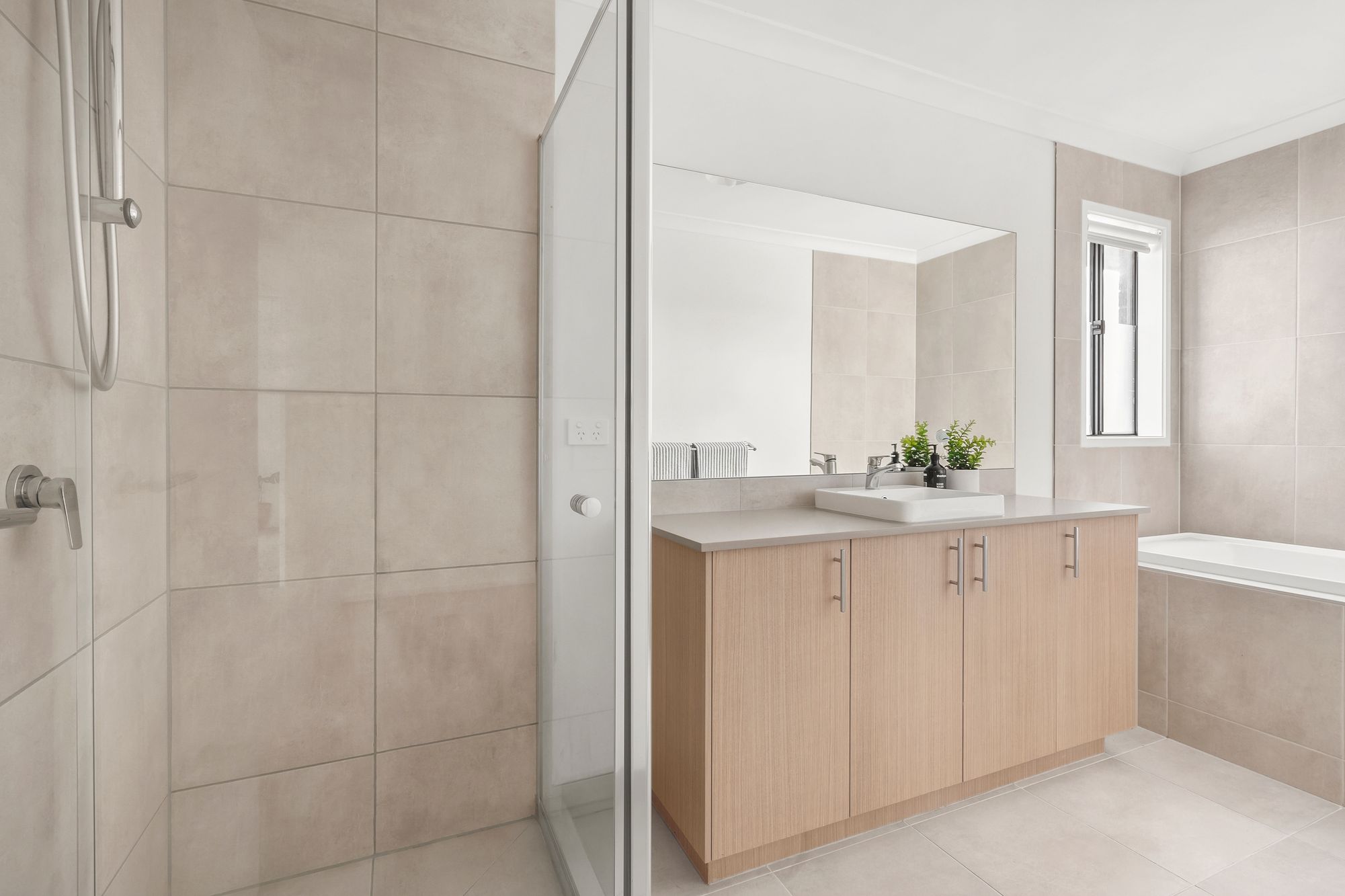Bathrooms: The main bathroom includes a raised bath, wide single vanity with 20mm stone benchtop, and a separate shower. A powder room downstairs adds further functionality with built-in shelving and cabinetry.