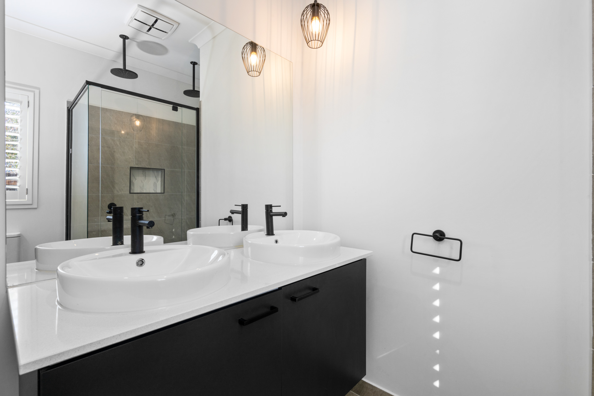 Master Bedroom: A serene sanctuary located downstairs featuring statement windows dressed with sheer curtains, ducted heating, downlights, TV points, and plush carpet. The spacious walk-in robe flows through to a stunning ensuite with an extended shower and niche, twin vanity with ample storage, black fittings, plantation shutters, and a private toilet.