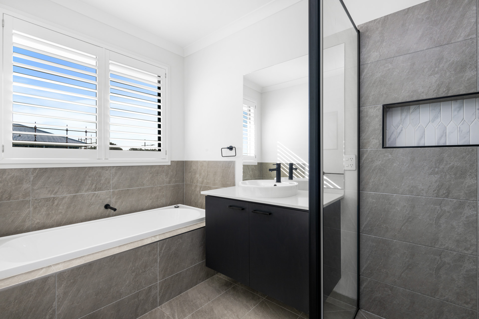 Main Bathroom: Showcasing a semi-frameless shower with niche, hand-held shower head, single vanity, bath, and separate toilet- all accented by plantation shutters and quality finishes.