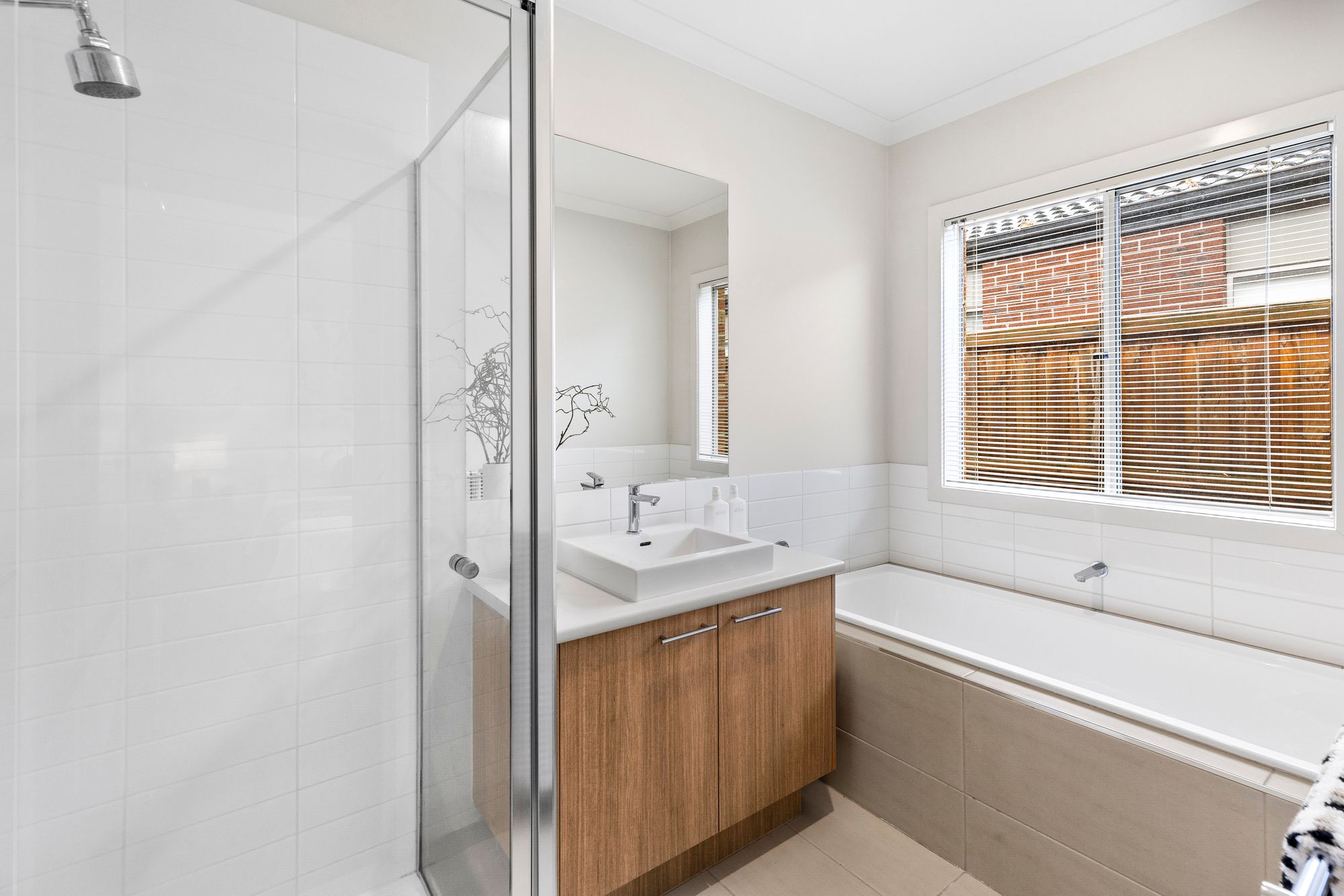 Main bathroom – Tiled, double vanity with storage, mirror splashback, downlights, semi frameless shower, chrome fittings, bath and separate toilet.