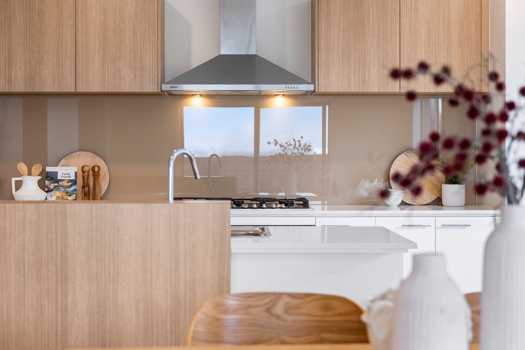 Kitchen – 20mm stone benchtops, island bench, double bowl sink, 900mm oven & integrated gas cooktop, overhead cabinetry, ample storage, dishwasher, glass splashback, chrome fittings, downlights, fridge cavity, cupboard pantry