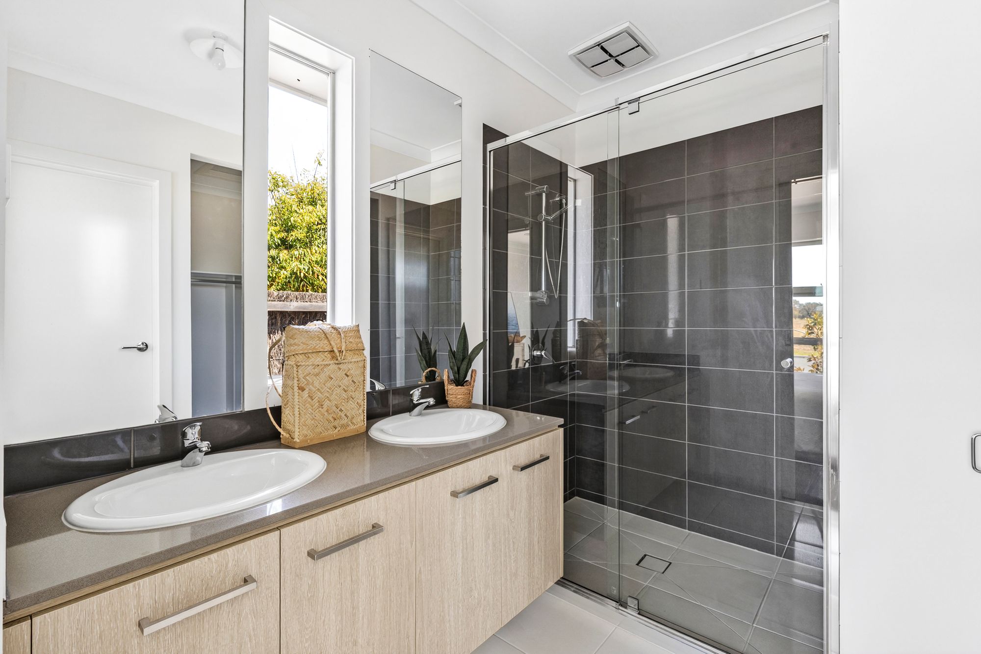 Ensuite: Dual shower, stone bench dual vanity, frameless mirror, toilet, storage