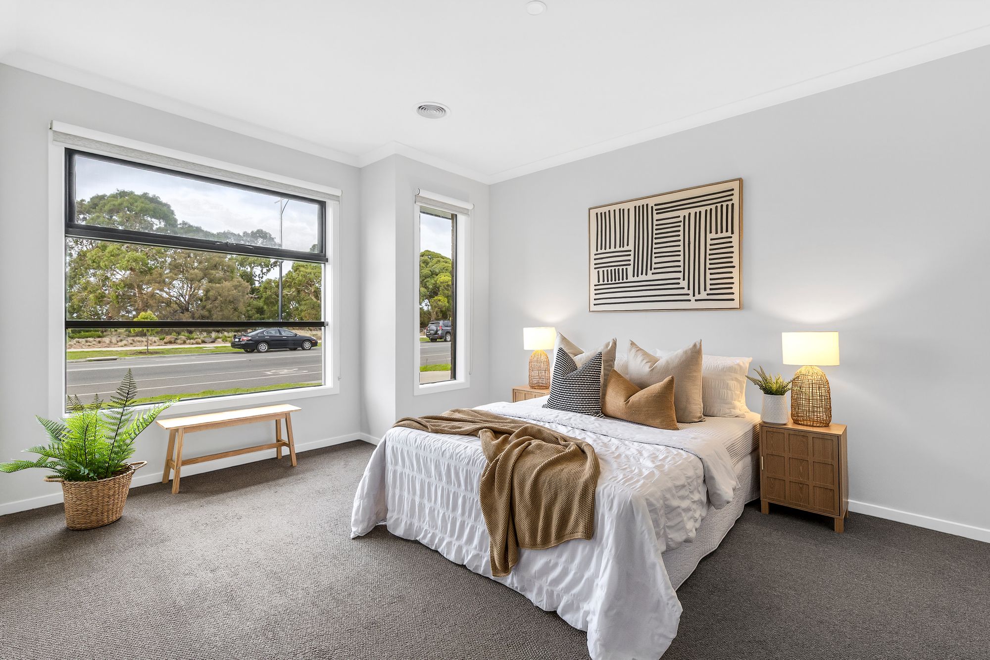 Master Suite: Featuring carpeted flooring, wide windows with roller blinds, downlights, ducted heating and evaporative cooling. The large walk-in robe provides an abundance of storage, while the stylish ensuite showcases a large vanity with dual basins, upgraded cabinetry, 20mm stone benchtops, a large mirror, extended shower with niche and hand held shower head, towel rack, and private toilet.