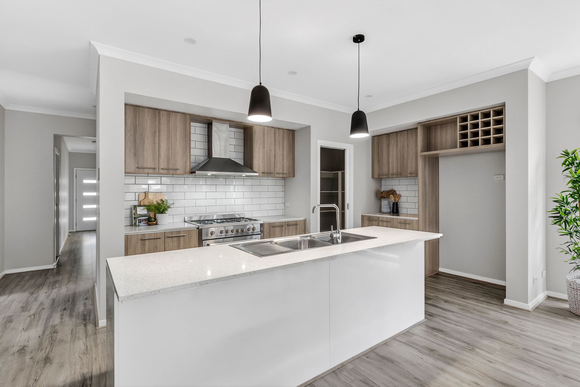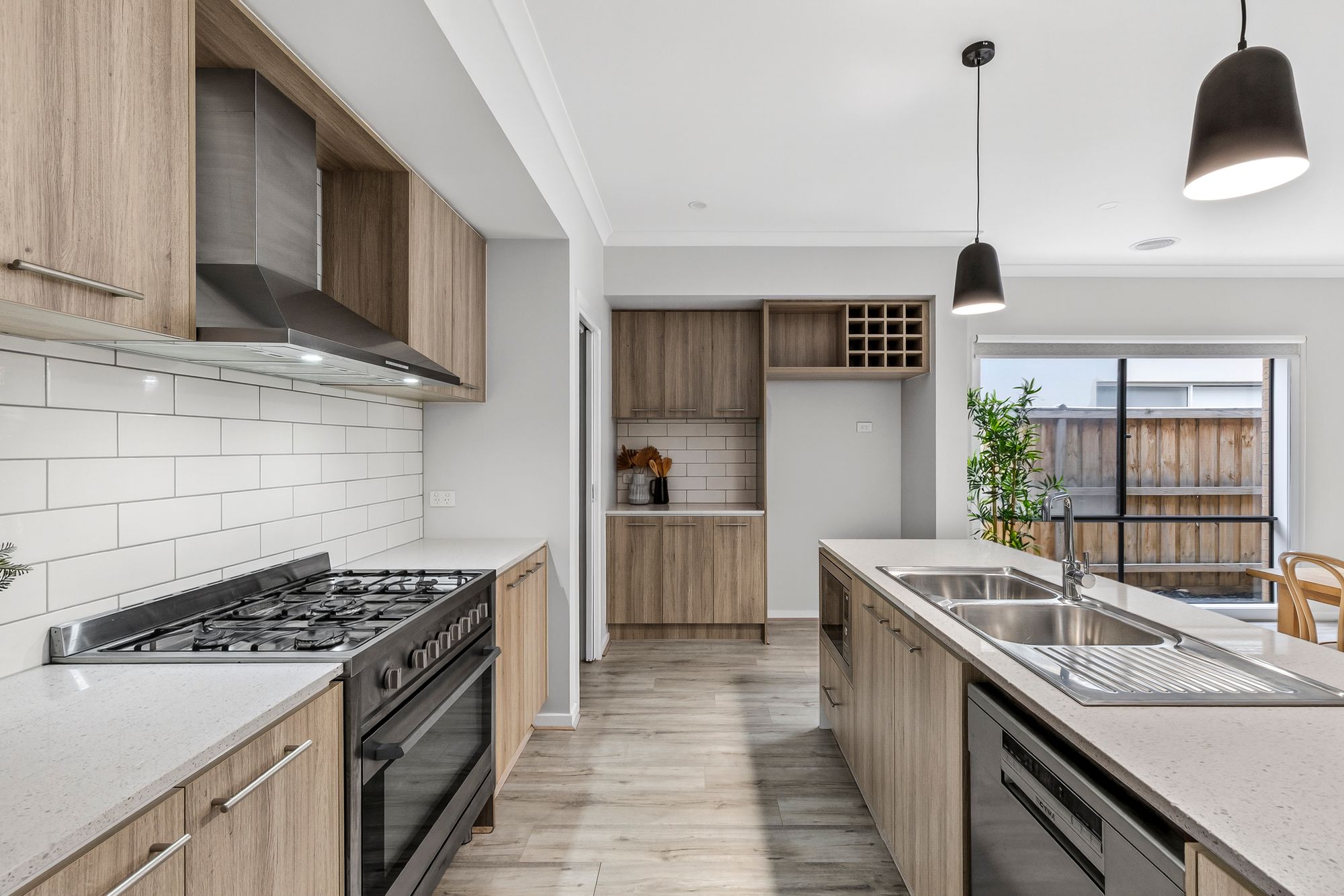 Kitchen: Featuring a large island with 20mm stone benchtops and a classic subway tile splashback, 900mm freestanding oven, gas cooktop, and rangehood, along with a spacious fridge cavity, built-in microwave provision and dishwasher. An additional coffee nook upgrade with matching stone benchtops enhances both style and functionality, while extensive cabinetry, a cubed wine rack, and a walk-in pantry provide an abundance of storage. Dual basin sink, timber laminate flooring, downlights, and brand-new feature pendant lighting add a modern touch to this impressive hub of the home.