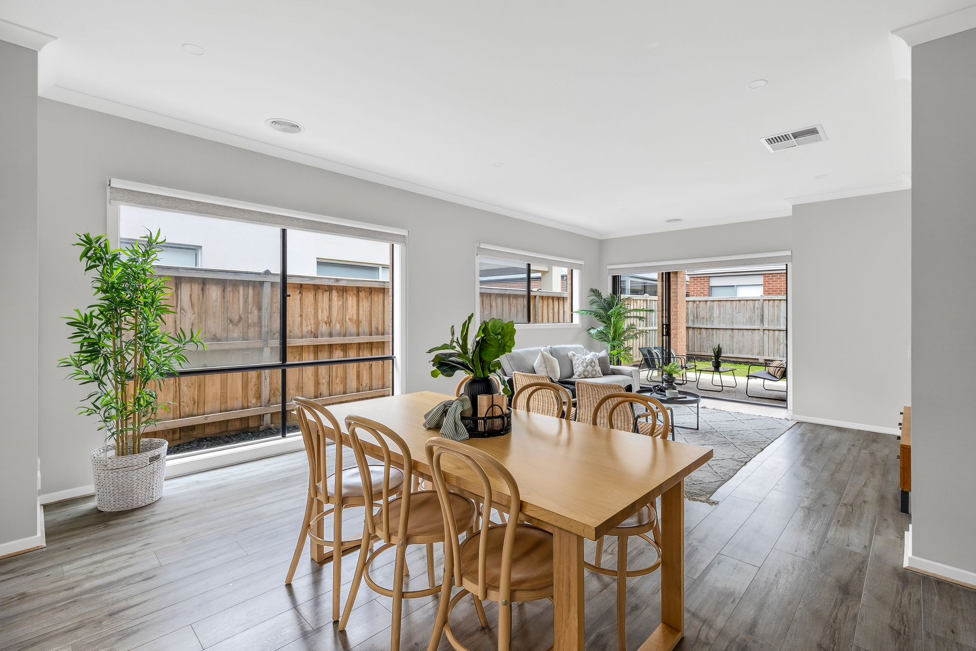 Open Plan Living & Dining: Enhanced by higher ceilings, comfort is assured year-round with ducted heating and evaporative cooling, while downlights and timber laminate flooring add a modern touch. Large windows and glass sliding doors, all fitted with roller blinds invite in natural light and provide seamless indoor-outdoor flow to the west-facing backyard.