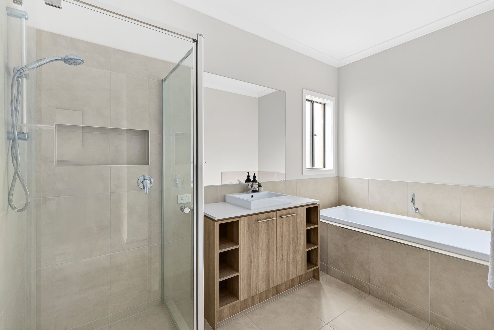 Main Bathroom: Well-appointed with tiled flooring, a single vanity and basin featuring 20mm stone benchtops and upgraded cabinetry, bathtub, large mirrored splashback, shower with niche & hand held shower head, as well as a frosted window for privacy and separate toilet, enhancing functionality for family living.