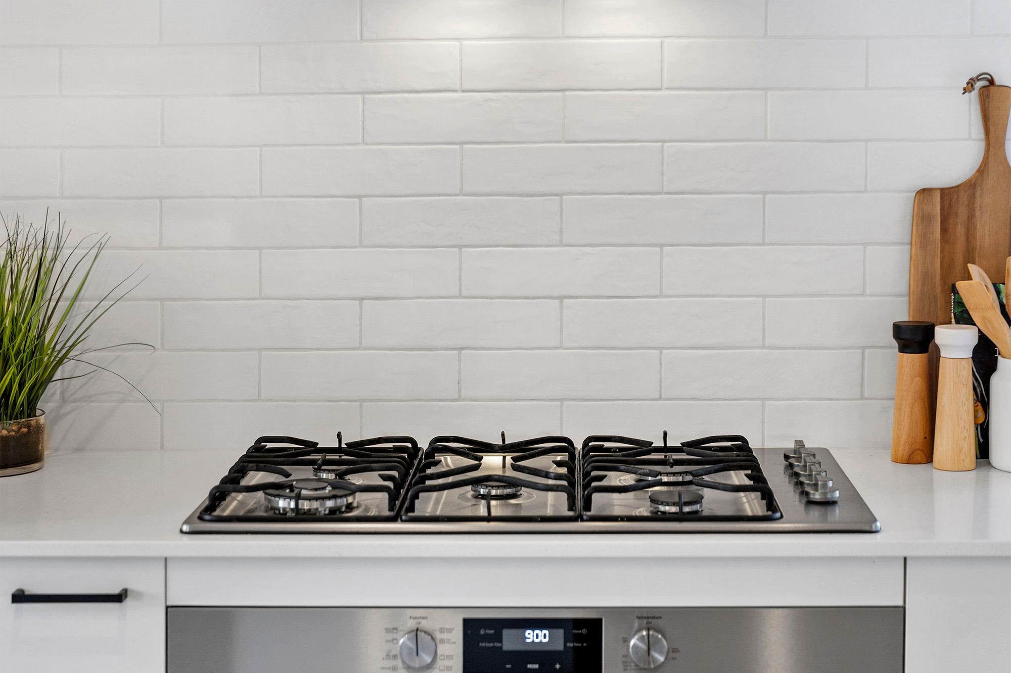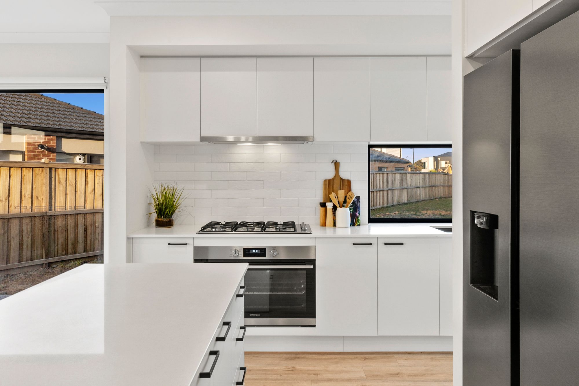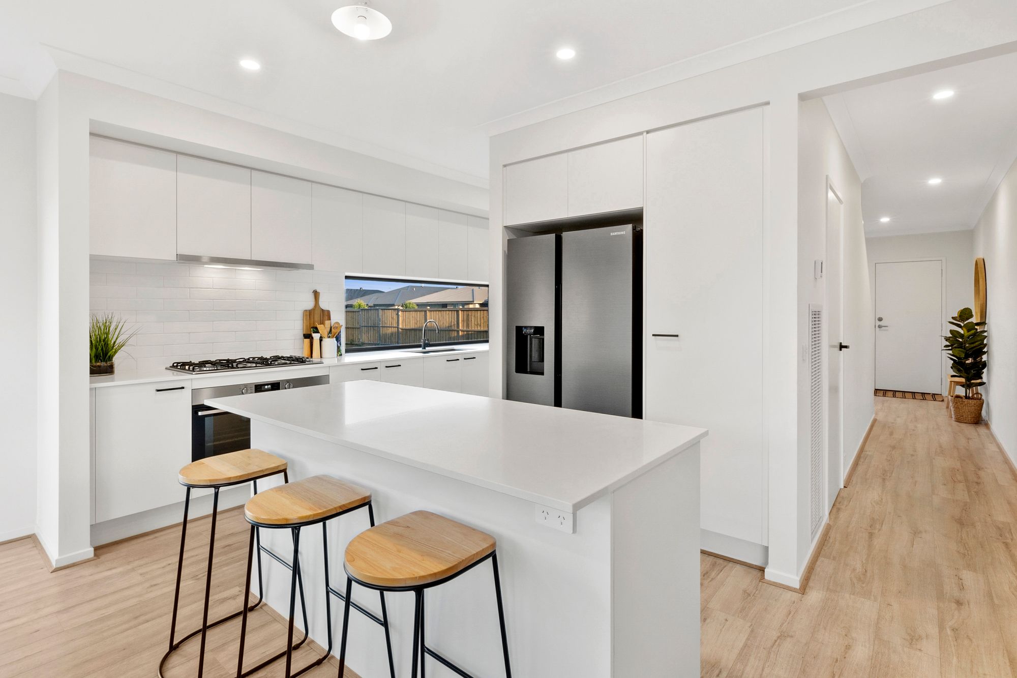 Kitchen: timber laminate flooring, stone bench tops including island bench with overhang for breakfast bench, large undermount sink, down lights, 900mm stainless steel appliances, window splash back overlooking the backyard, a spacious walk in pantry with ample shelving & storage connecting directly to your laundry, overhead cabinetry & drawers throughout, microwave provision, matte black fittings and fixtures, ducted heating