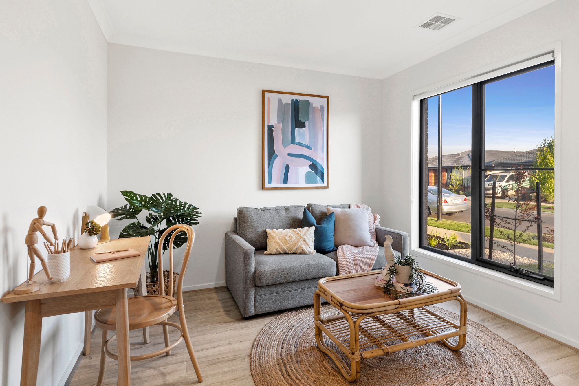 Sitting room/ home office: secluded to front of home, can be used as study/ toy room/ sitting room, timber laminate flooring, down lights & roller blinds, ducted heating