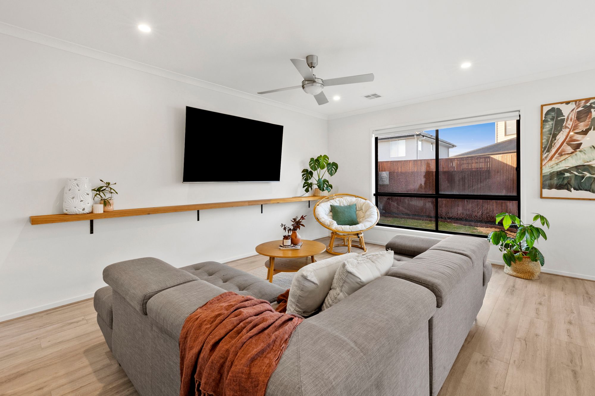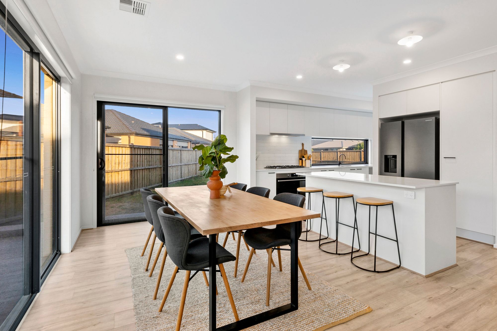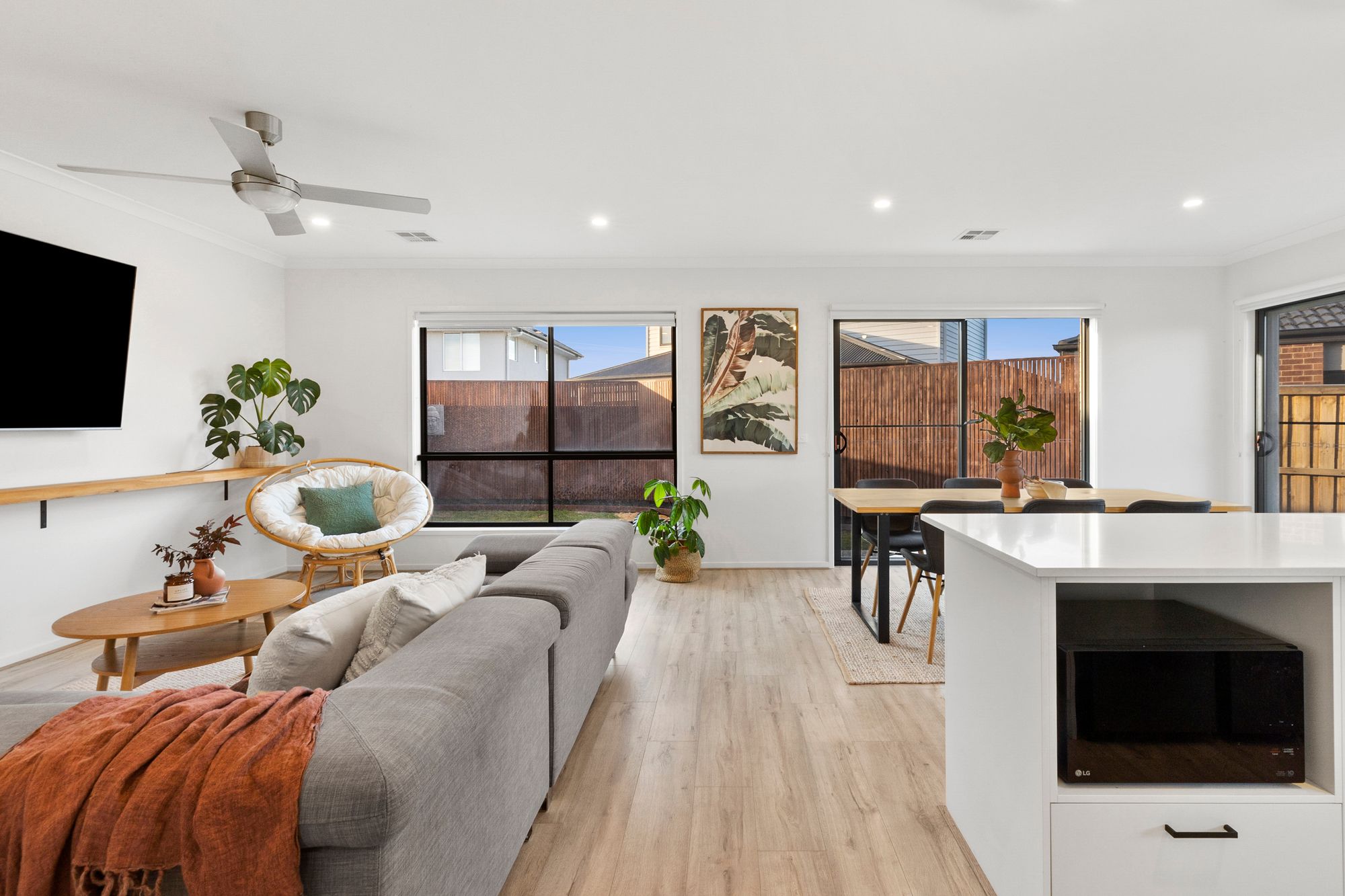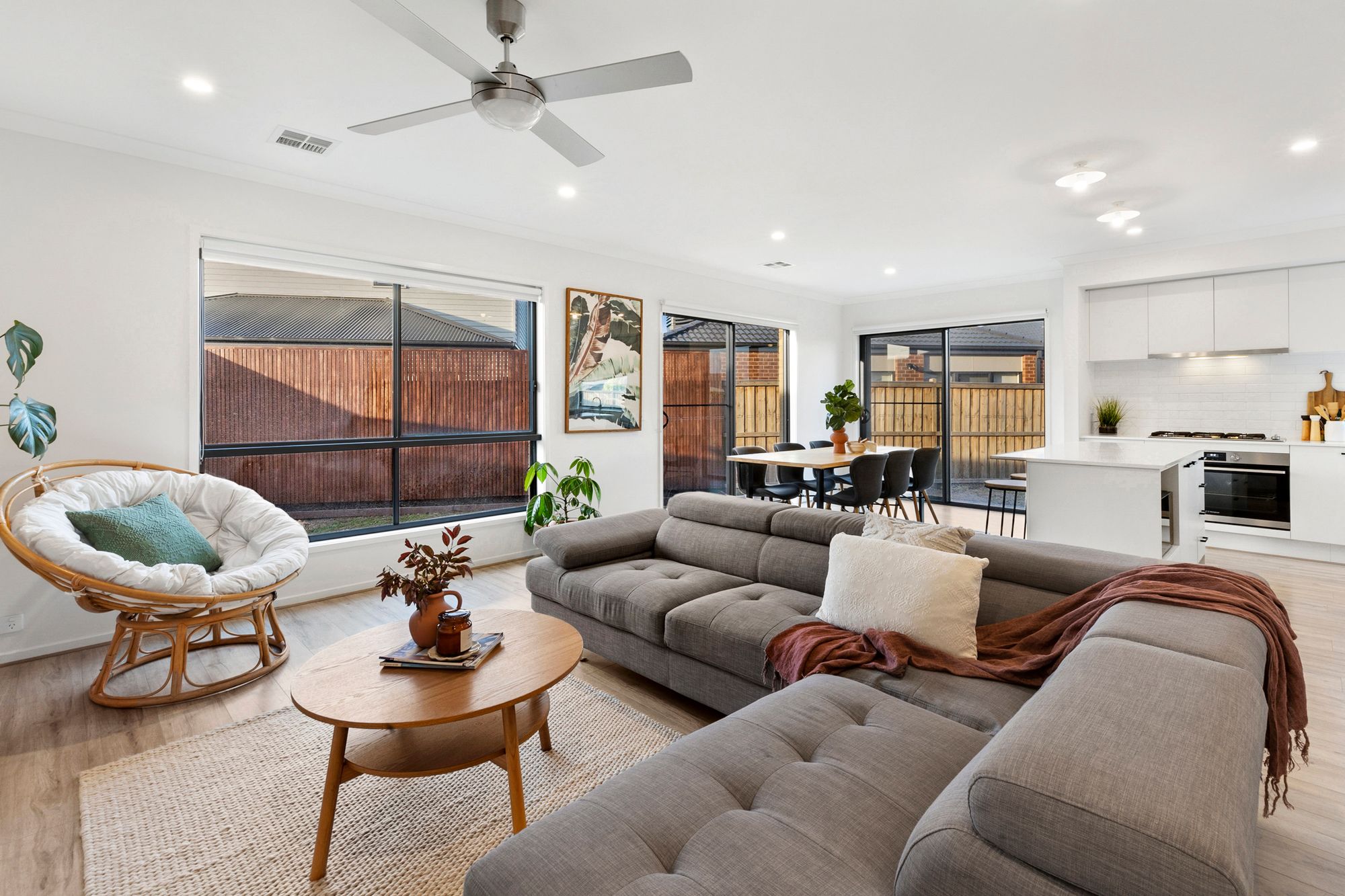 Living: open plan kitchen/ living/ dining, timber laminate flooring, floating feature shelf, down lights, roller blinds, stainless steel ceiling fan, ducted heating, glass sliding stacker doors leading to outdoor area creating an indoor/ outdoor flow