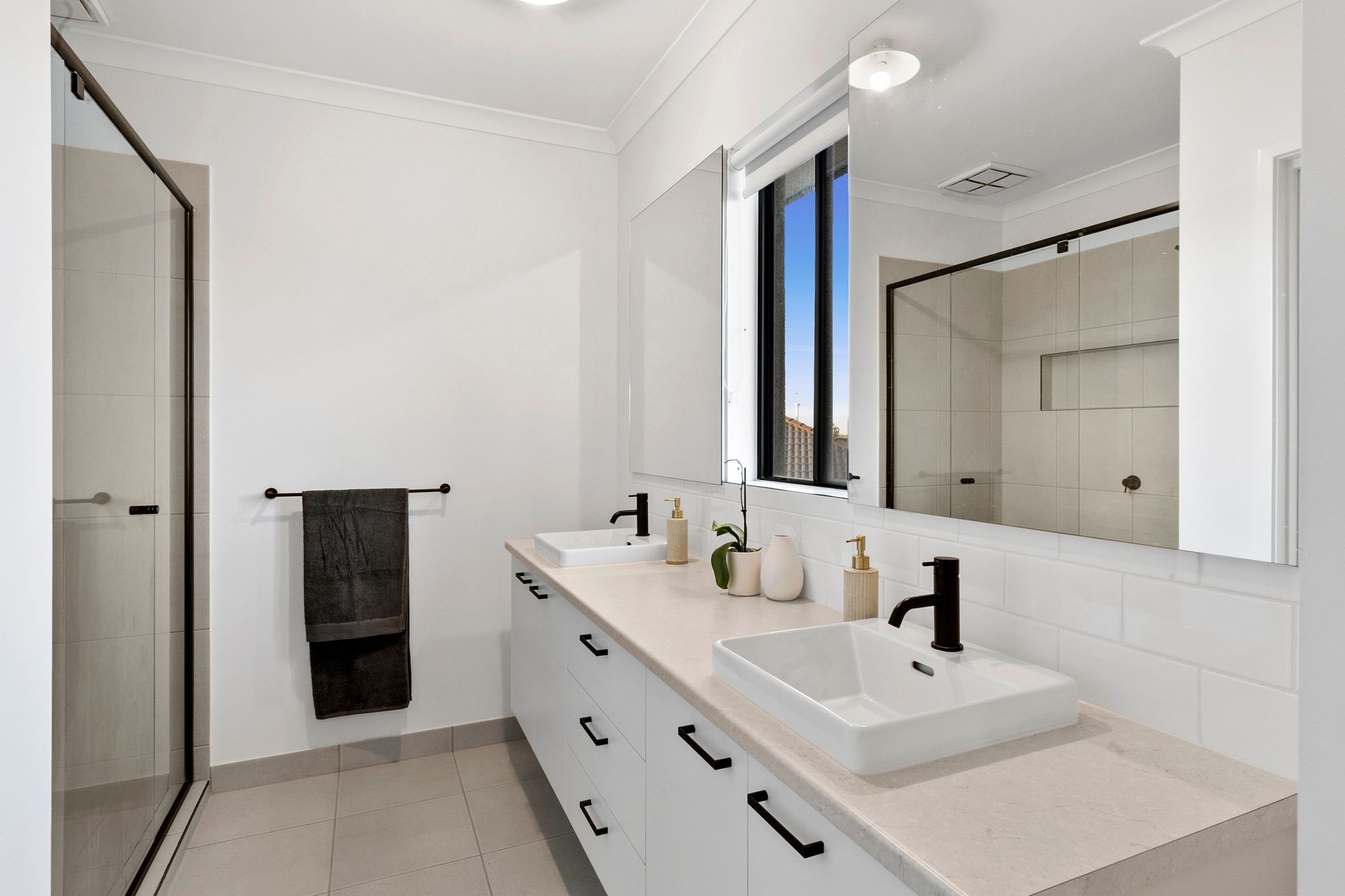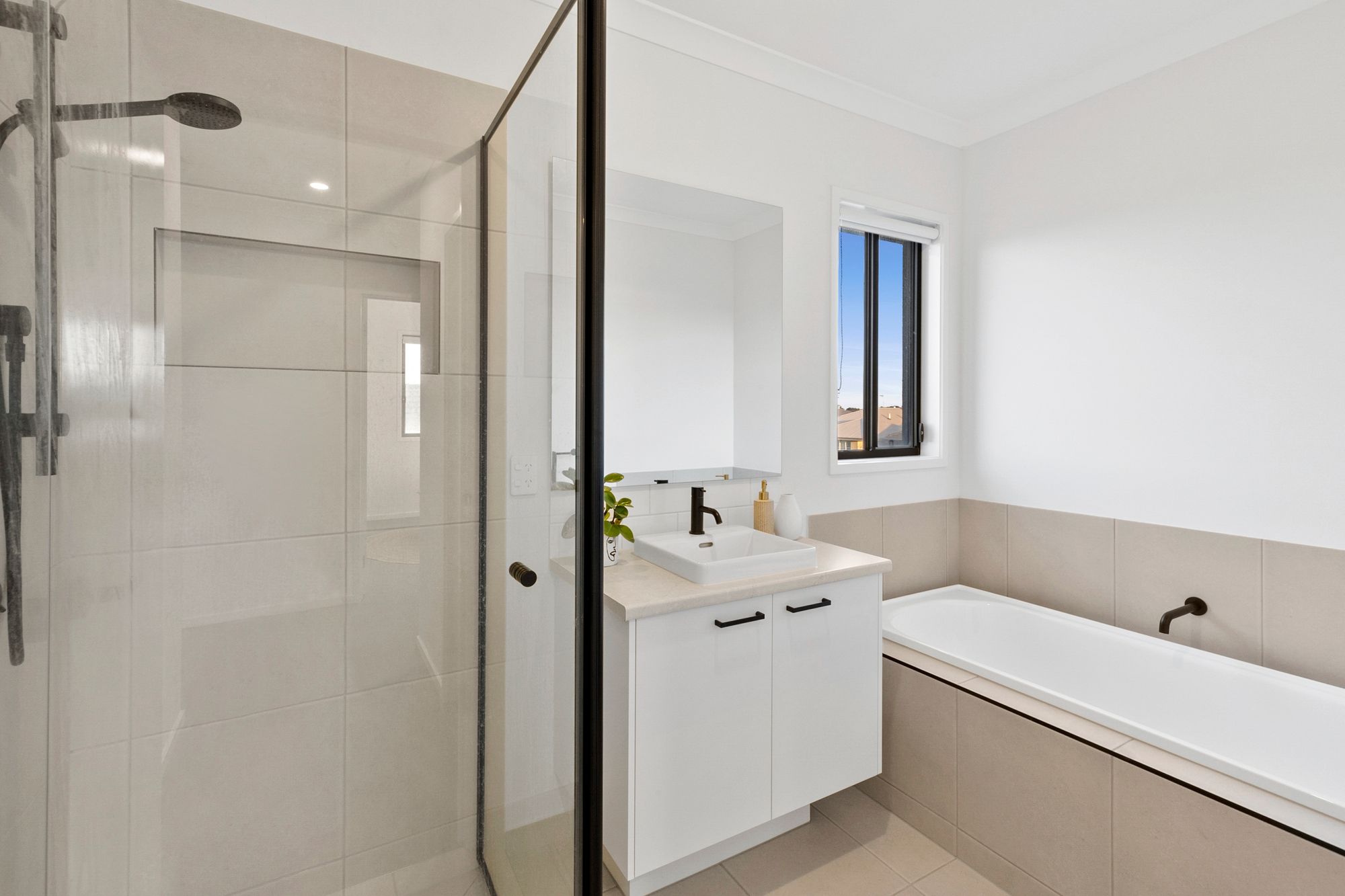 Main bathroom: tiles, bath, tiled shower with niche, single vanity, black tap ware and finishes, window with roller blind, separate toilet