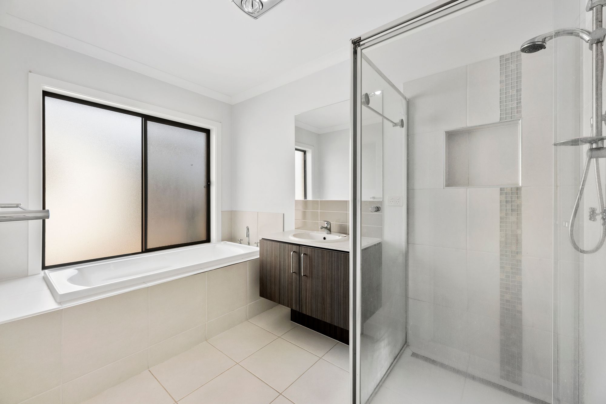 Main bathroom – Semi frameless shower with niche, bath, single basin and vanity, mirror splash back, chrome fittings, separate toilet.