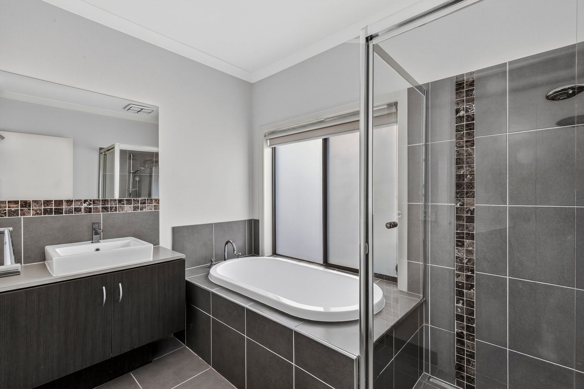 Main Bathroom: Bath, single vanity with stone benchtops and ample storage, large mirror, tiled splashback frosted window with roller blind, fully tiled shower with and handheld shower head, separate toilet, towel rack.