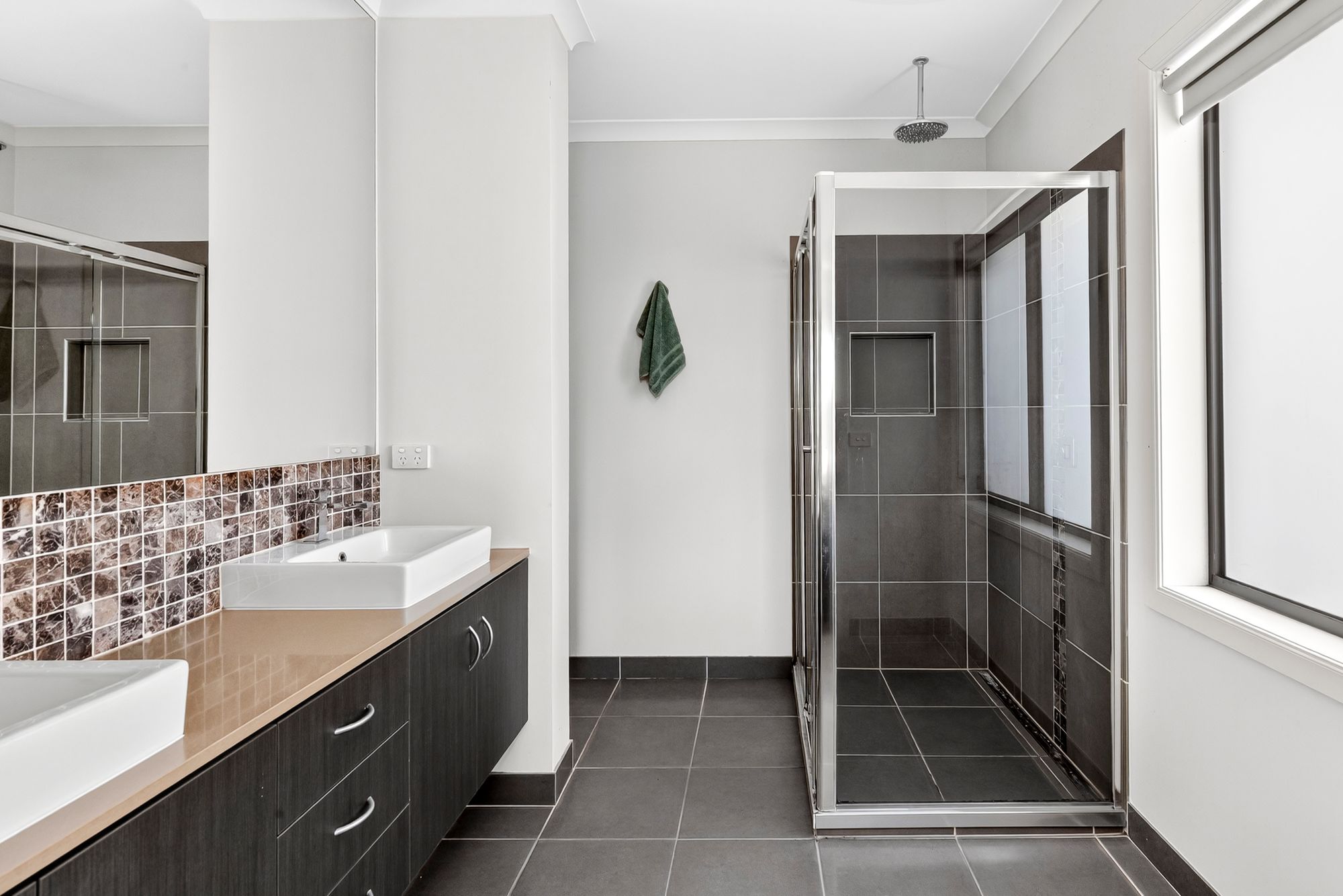 Ensuite: Double vanity with stone benchtops and ample storage, large mirror, tiled splashback, frosted window, fully tiled shower with niche and waterfall shower head, open toilet.
