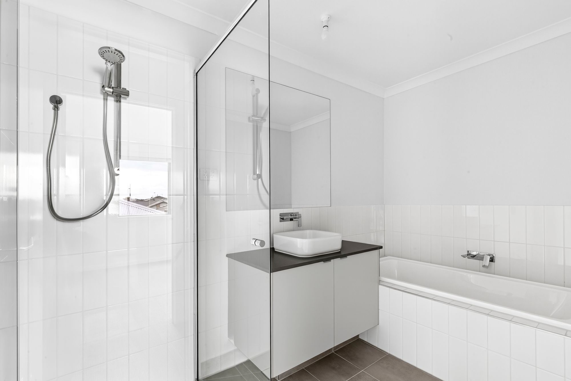 Main Bathroom: Stylishly appointed with a semi-frameless shower, handheld shower head, vanity with 20mm stone benchtop, mirrored splashback, separate toilet, and floor-to-ceiling tiles.