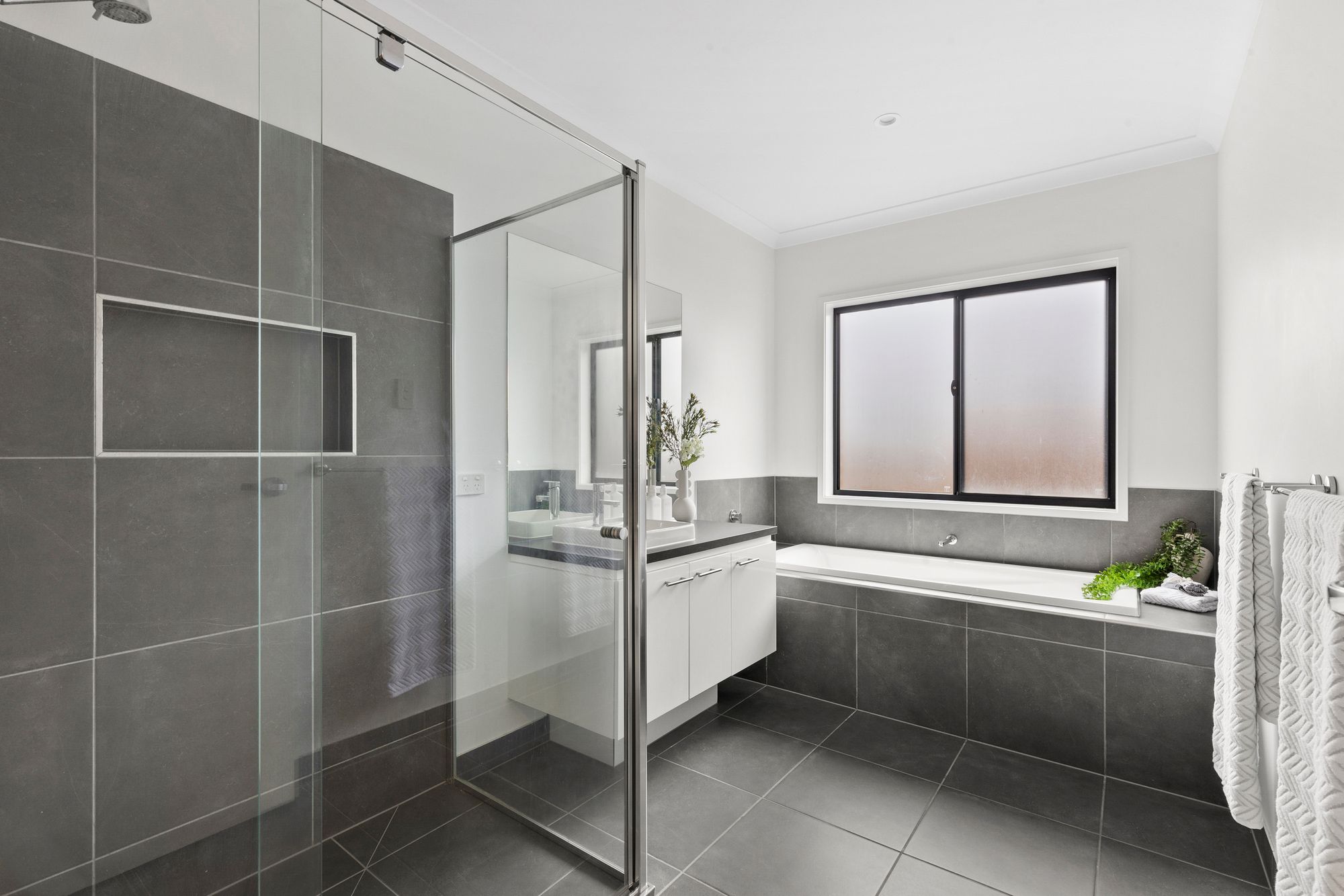 Main Bathroom: Single basin vanity, bath, semi-frameless shower, tiles and chrome fittings.