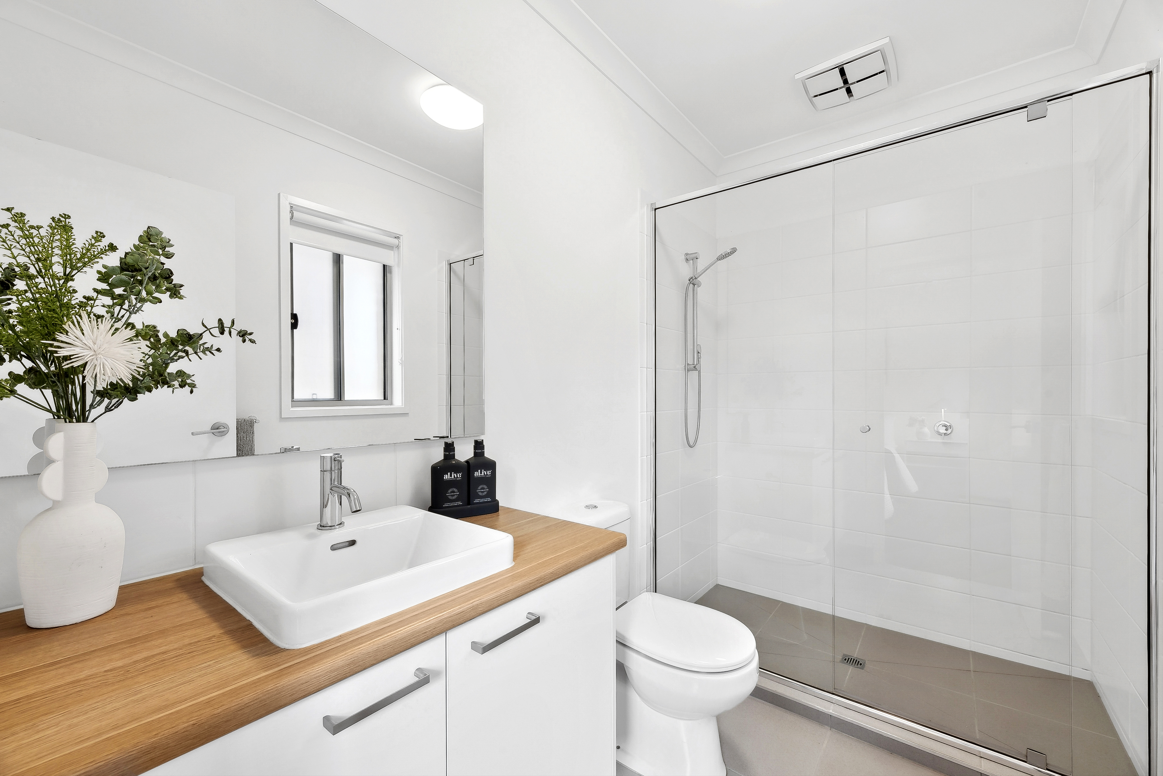 Master suite: carpet flooring, ducted heating, window with roller blinds, ensuite with extended semi-frameless shower, tiles, basin and vanity, mirror splash back & toilet.