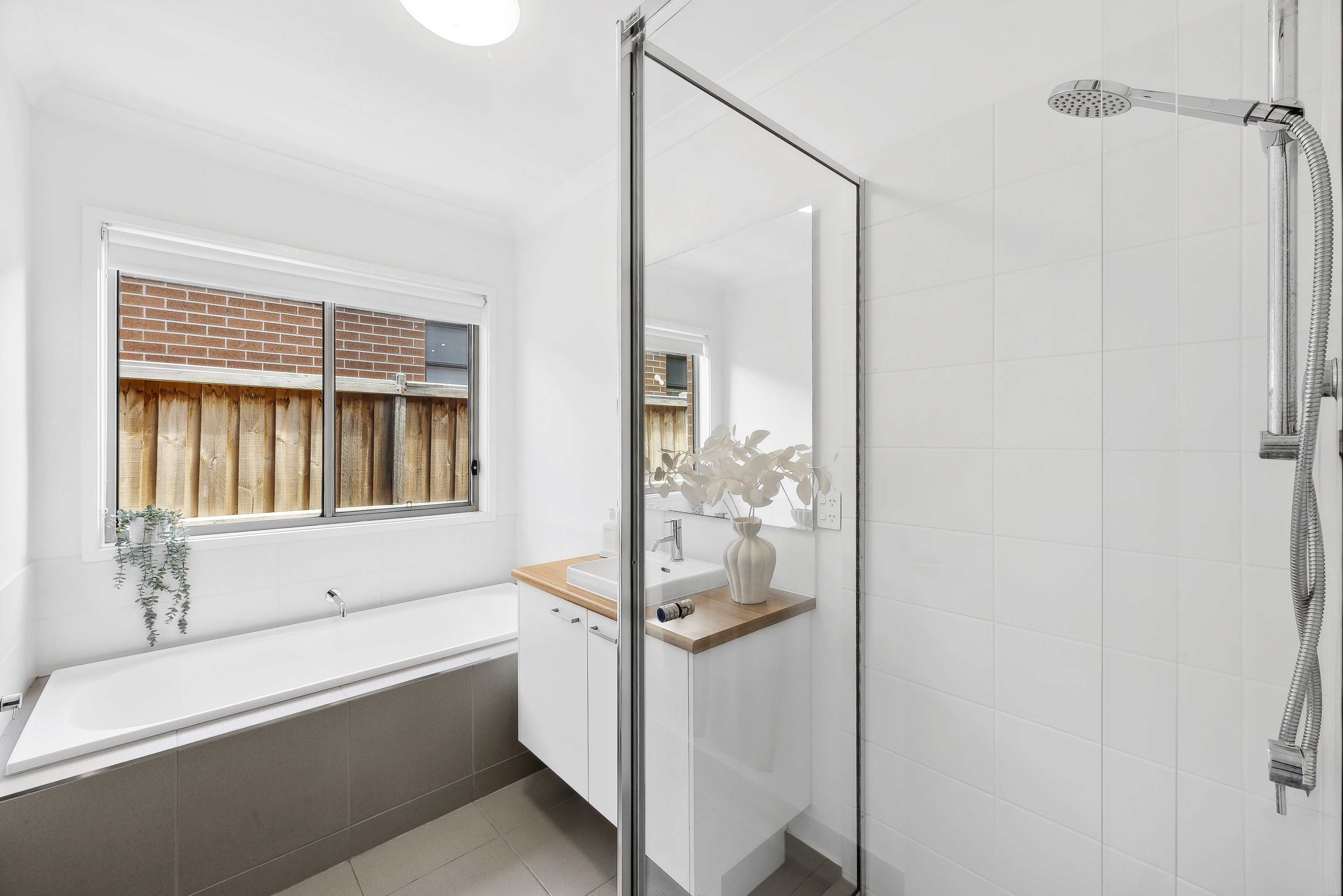 Main bathroom: semi-frameless shower with hand-held shower head, bath, tiles, basin and vanity, tile and mirror splashback.