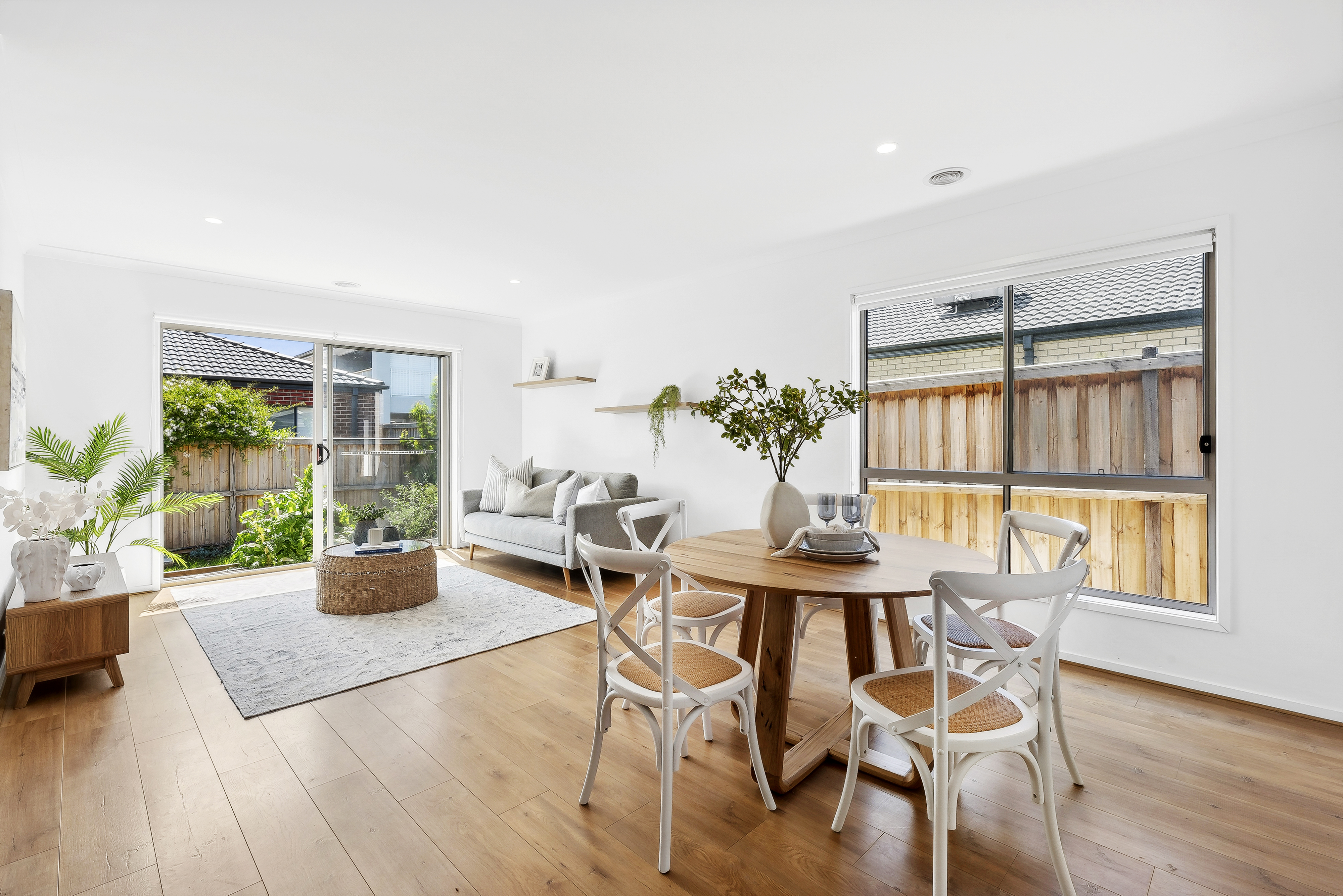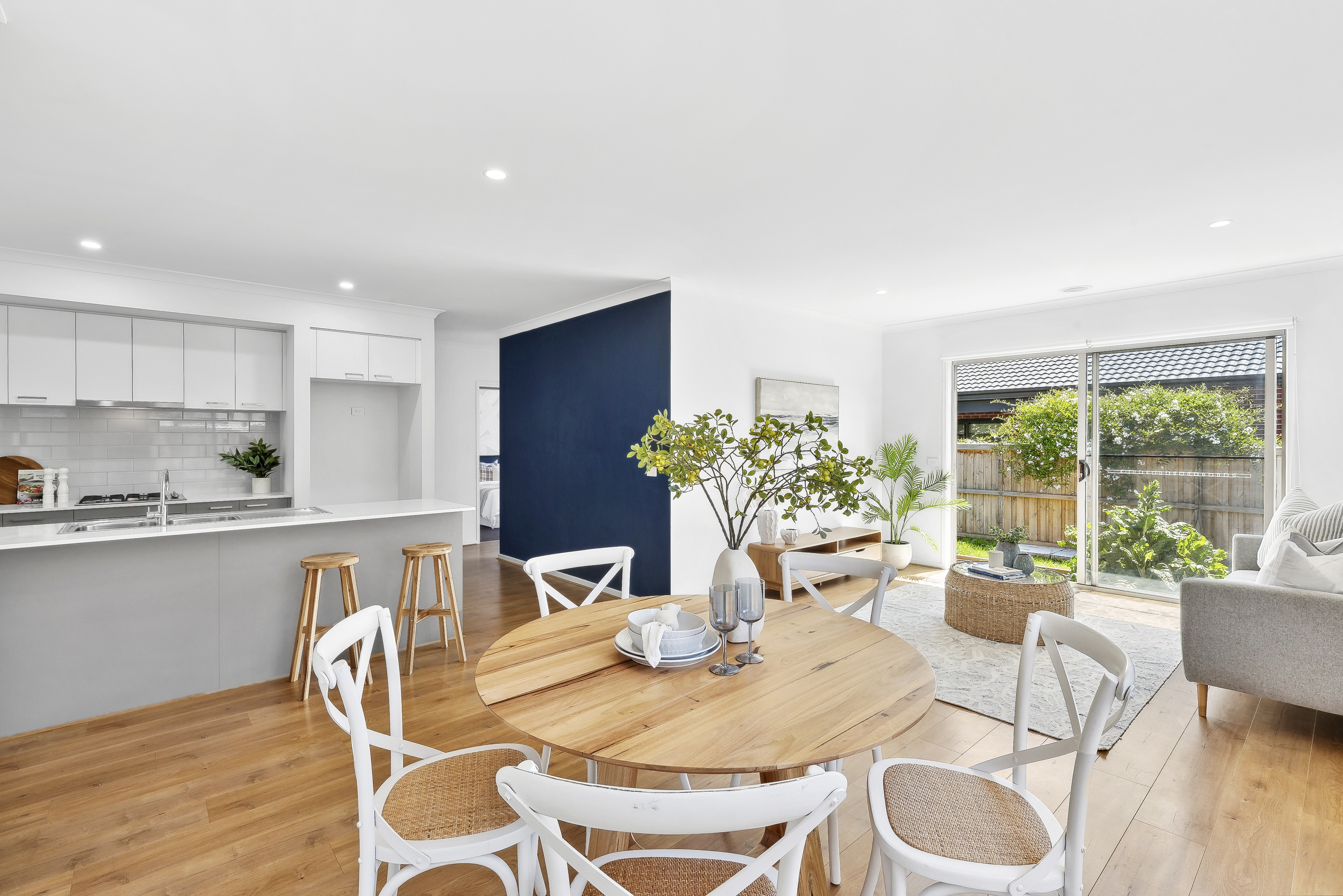 Living area: open plan kitchen/living/dining, expansive dining space, downlights, timber-look laminate flooring, ducted heating, roller blinds, sliding glass doors through to low maintenance backyard.